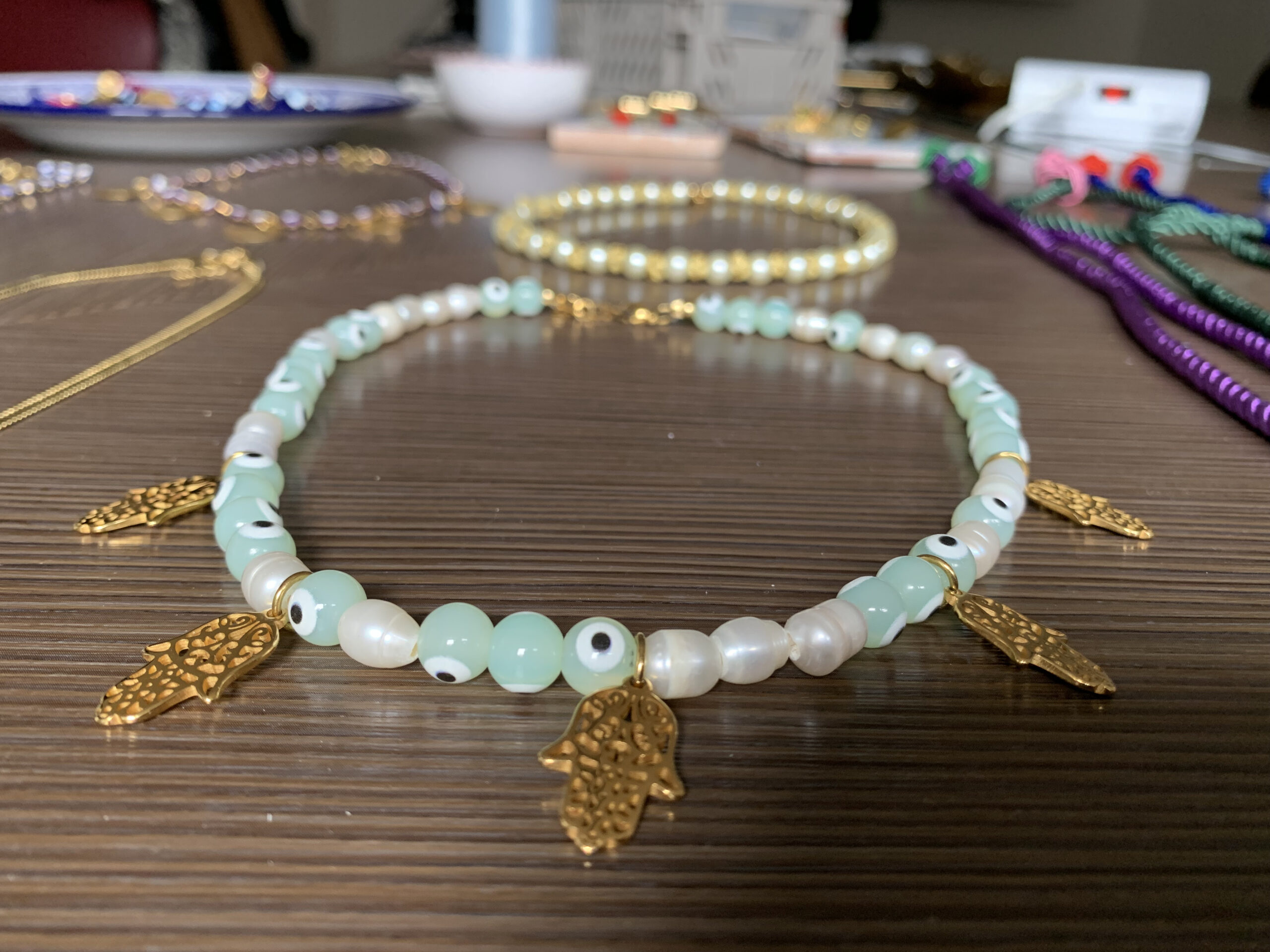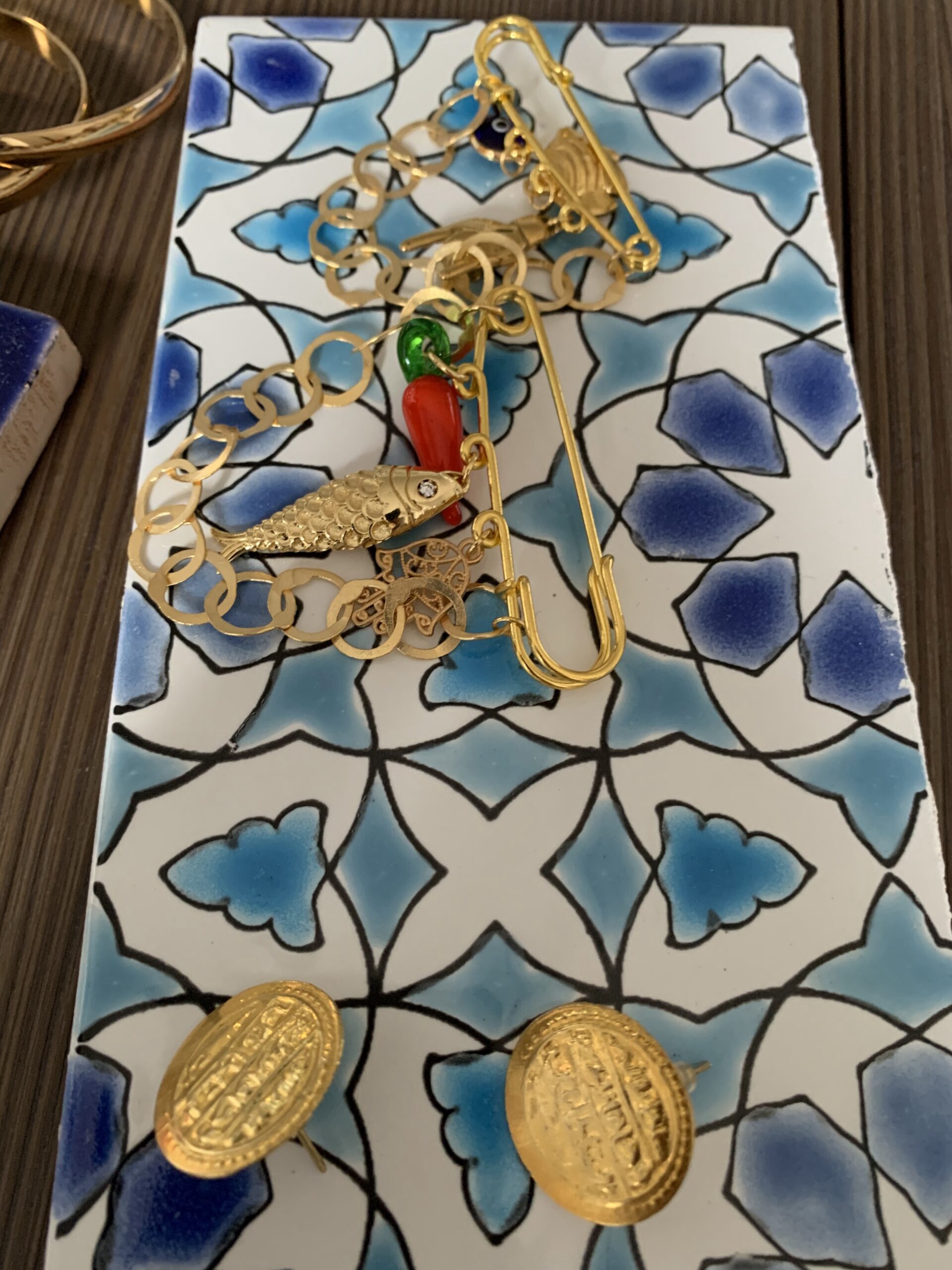 “Fin da piccola avevo in testa di realizzare qualcosa di mio, e ho sempre creato a mano, dalle gonne con la kefia, alle illustrazioni. In Francia tutti i giovani, anche se figli di immigrati in quartieri popolari, si lanciavano in progetti. Mi sono detta che valeva la pena provarci. Per un periodo ho studiato come potessi realizzare la mia idea: per le Tote bag sono andata nella medina di Tunisi, ho trovato due tessuti per i quali ho avuto un colpo di fulmine e ho fatto realizzare una pochette a partire da un tappeto amazigh. Il sarto mi dava della pazza, perché è un tessuto che non si usa normalmente per cucire, ma sono andata avanti con la mia idea e le ho cucite con questo tessuto e raso di seta: così è nata la “ilim pochette”. Per quanto riguarda i gioielli, ho cominciato con i pendenti mahboub, con le scritte in arabo, e con quelli con la lira ottomana. Gli orecchini, gli anelli e i pendenti sono in rame placcato oro, realizzati da artigiani locali. Per la collana “trendy”, ho preso le catene di stoffa usate per le tende e i bottoni tipici”.