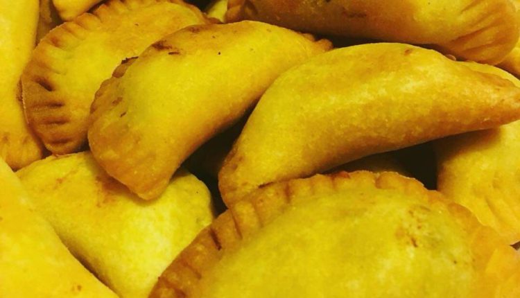 In una ciotola versate la semola, il sale, il burro, la curcuma e date una mescolata. Aggiungete progressivamente l’acqua e lavorate l’impasto fino ad ottenere un impasto morbido e non appiccicoso. Coprite con della pellicola alimentare e mettete 30 minuti in frigorifero. Nel frattempo preparate la farcia mescolando insieme tutti gli ingredienti. Passata la mezz’ora, stendete l’impasto e tagliate dei cerchi con un bicchiere. Prendete un cerchio alla volta, spennellate il bordo con dell’acqua, farcite, e chiudete premendo con i rebbi di una forchetta. Friggete nell’olio caldo a fuoco medio.