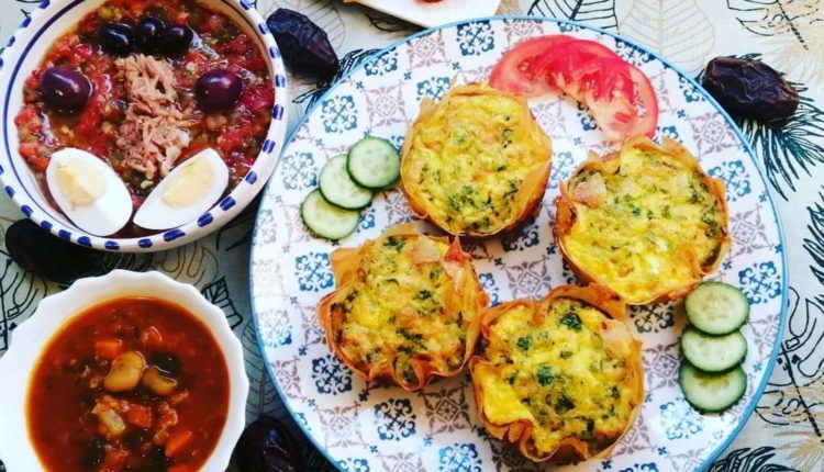 Il tajine tunisino, a differenza di quello marocchino, è uno sformato a base di uova a cui vengono aggiunti carne, pesce, verdure, formaggio e spezie. La mia versione, è uno dei più classici, ossia il tajine maadnous, (tajine al prezzemolo), che io ho porzionato in uno stampo da muffins coperto di fogli di malsouka (fogli per brik).