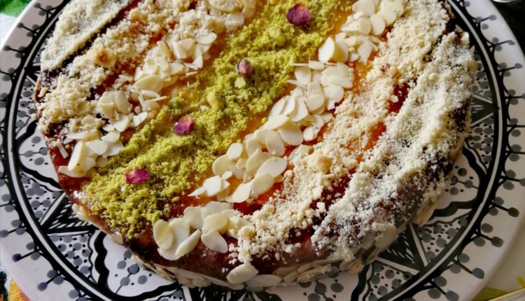 Il khobzet fekia o torta di frutta secca, è uno dei dolci casalinghi classici tunisini. Io di solito lo preparo a fine Ramadan, con i resti di frutta secca che ho usato per fare i biscotti dell’Eid. Si prepara facilmente e si può fare con o senza sciroppo di zucchero. A me piace variare, e visto che la torta in sé era già morbida così, ho soltanto spennellato la superficie e i bordi con della marmellata di albicocche.