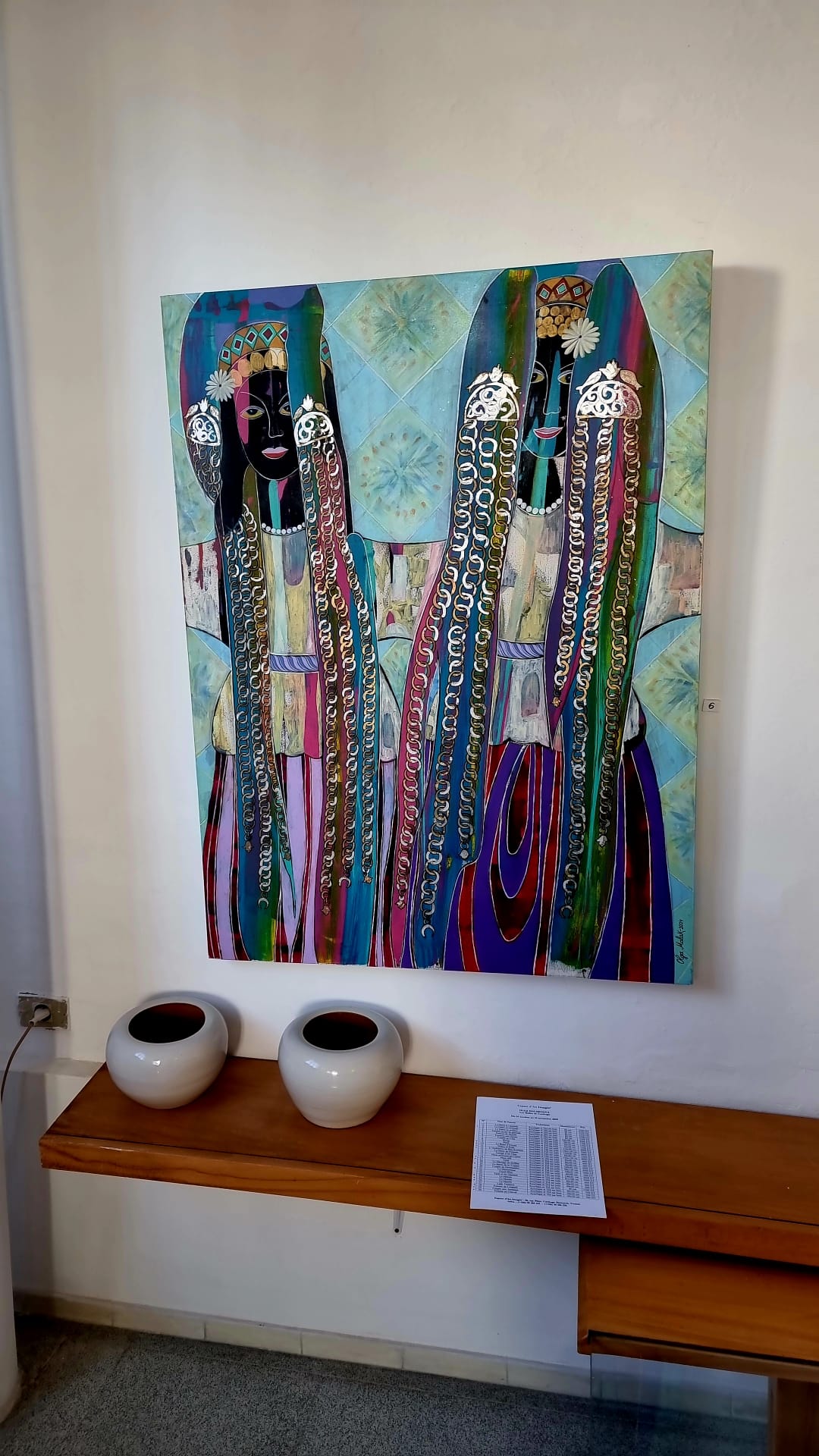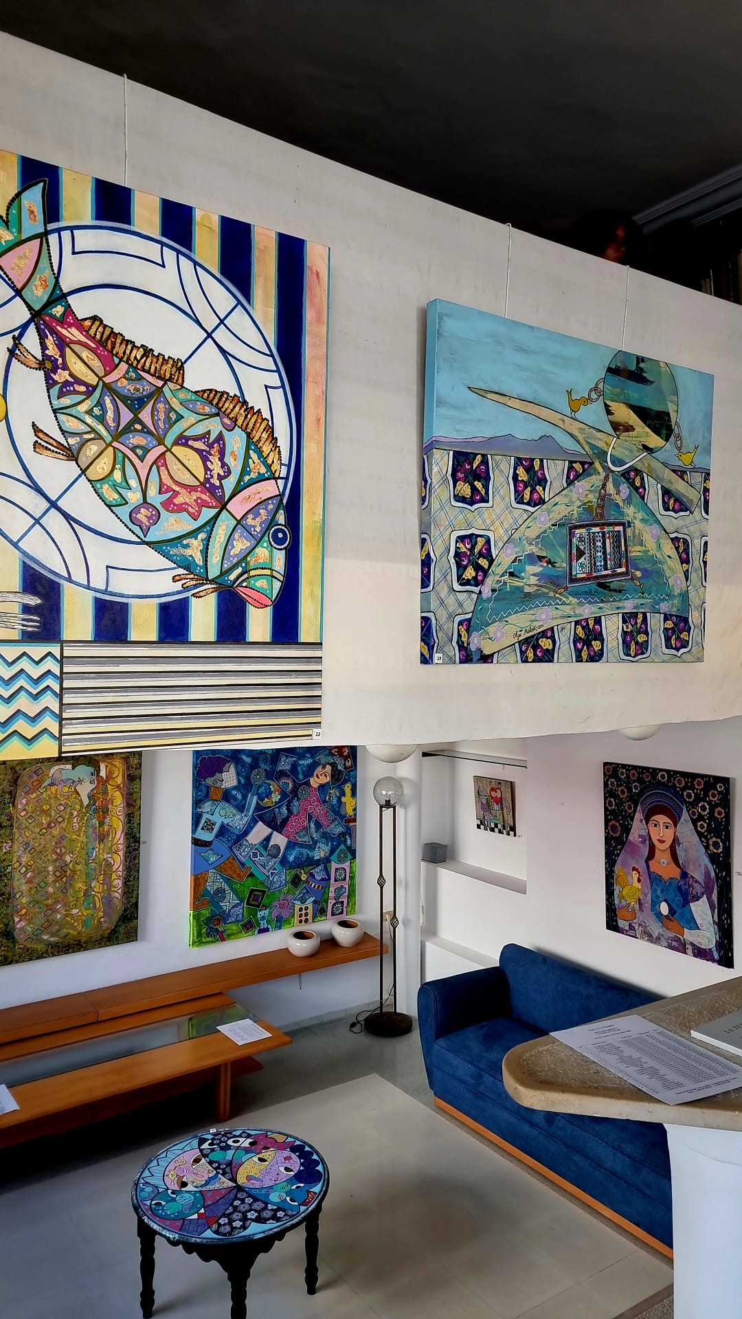 A uscire dall’Espace d’Art Imagin’, si avverte una sensazione precisa: come se le donne dei mosaici antichi, spogliate della loro sede museale, avessero momentaneamente trovato riparo nelle tele dell’artista, e da lì continuassero a osservare, a custodire, a raccontare. È un’impressione lieve ma persistente, quella di aver vissuto un piccolo passaggio di testimone tra epoche diverse. E, in fondo, l’augurio resta lo stesso, discreto ma affettuoso, come una formula che attraversa il tempo: Hout 3alik. Che il pesce porti fortuna anche a chi guarda.