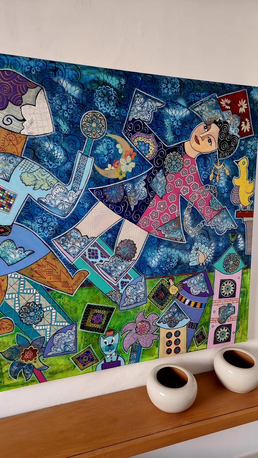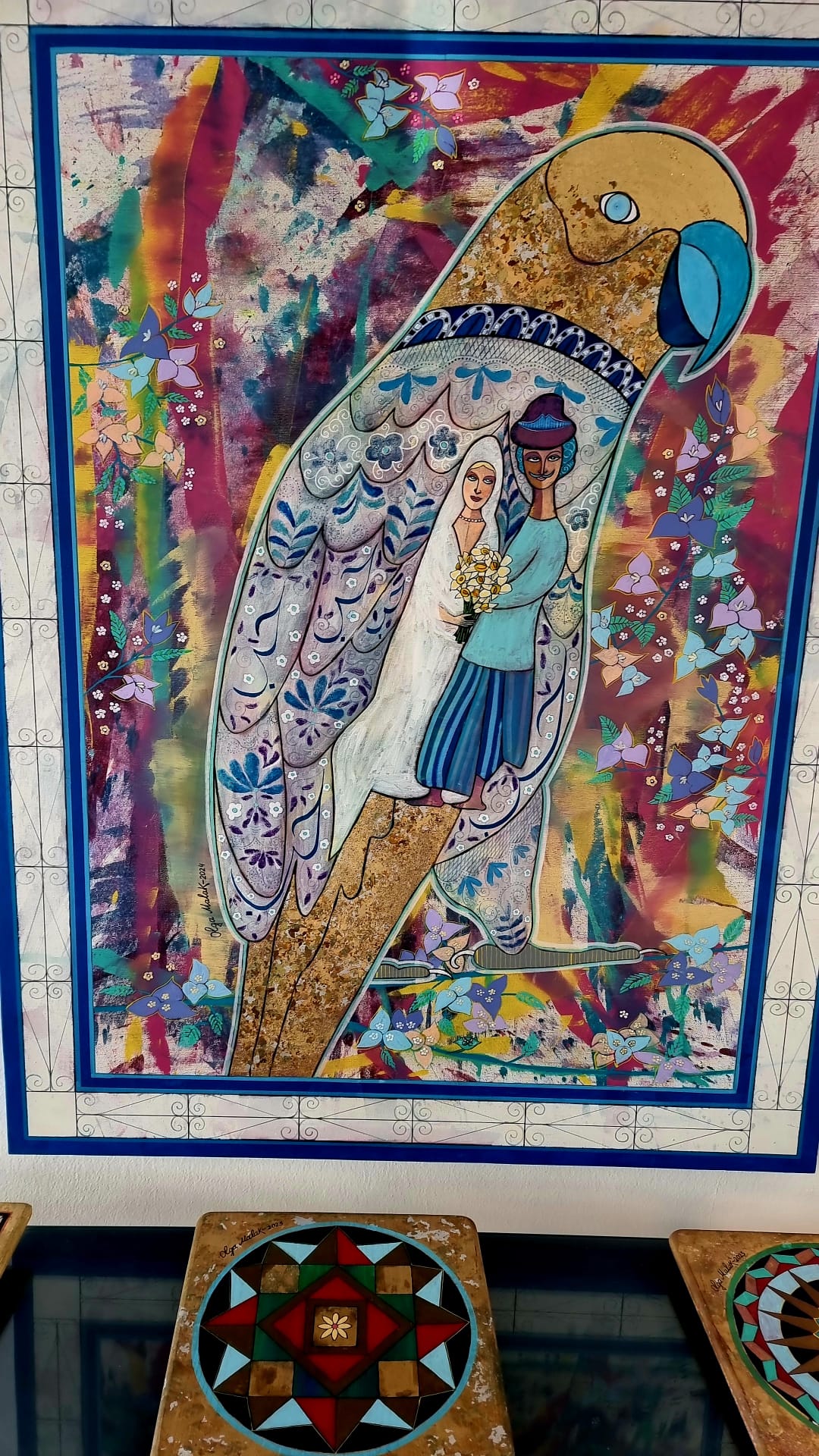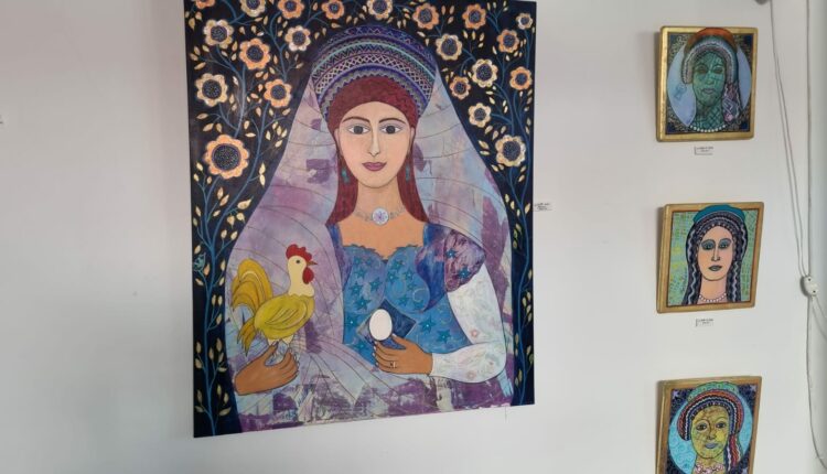 Malakhova, estone di origine e tunisina d’adozione, accoglie i visitatori con la semplicità di chi ha fatto dell’arte un ponte quotidiano tra culture. Racconta come molte delle donne raffigurate nelle sue opere derivino proprio dai mosaici del museo del Bardo: “Sono voci antiche che continuano a parlarci”, dice. Nei suoi quadri, quegli sguardi sopravvissuti ai secoli ritrovano un contesto vivo, moderno, ma ancora immerso in una memoria sensibile e rispettosa. La sua tecnica, paziente e meticolosa, riprende la gestualità del mosaico: ogni dettaglio è costruito come una piccola tessera, un frammento che concorre a una figura più grande. È un approccio che permette all’artista di fondere epoche e stili, passando dalle forme classiche alle citazioni dei grandi maestri. Così, il Bacio di Klimt o la Sposa volante di Chagall diventano pretesti per raccontare una Tunisia luminosa, tessuta di motivi tradizionali, ceramiche, geometrie berbere e colori che oscillano tra il blu mediterraneo e i toni caldi della terra.