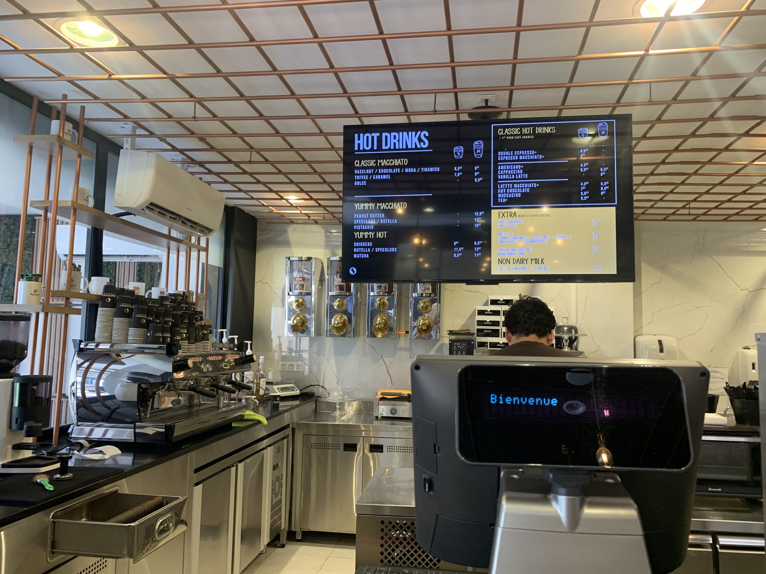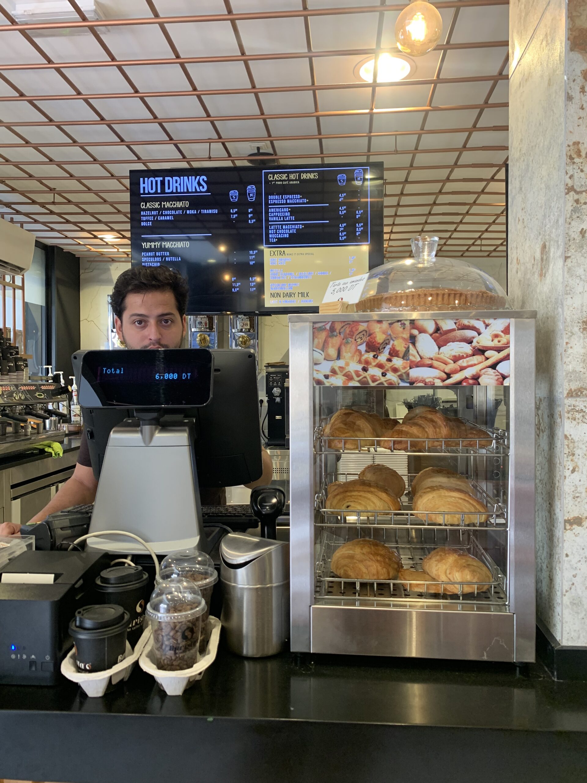 In alternativa, dopo quest’ora, potete ordinare diversi tipi di caffè – con topping e gusti più disparati, dal caramello al tiramisù, alla nutella, al the matcha oppure bevande fredde (caffè freddi, succhi, the freddi, affogati) e le loro deliziose torte: dalla red velvet, alla cheesecake, ai brownies o una semplice cake e i biscottoni. I prezzi sono più alti rispetto alla media: l’espresso macchiato costa 4 dinari; le torte vanno dai 3 ai 10 dinari. Ci sono anche panini ed insalate per la pausa pranzo e in un tavolino a parte, lo zucchero (anche di canna! Cosa rara nei cafè in Tunisia), il cacao e la cannella in caso si volesse mettere anche quello nel caffè.