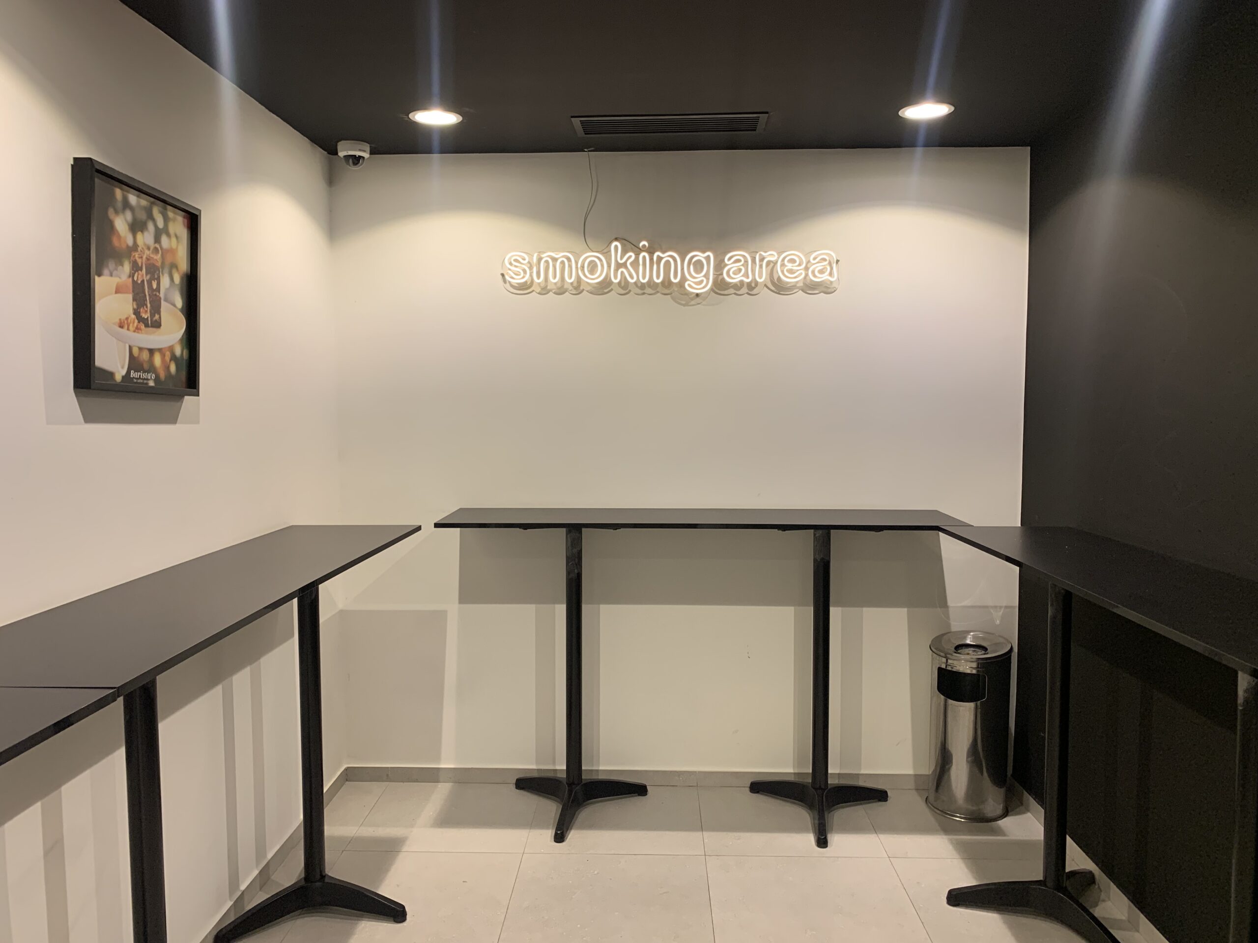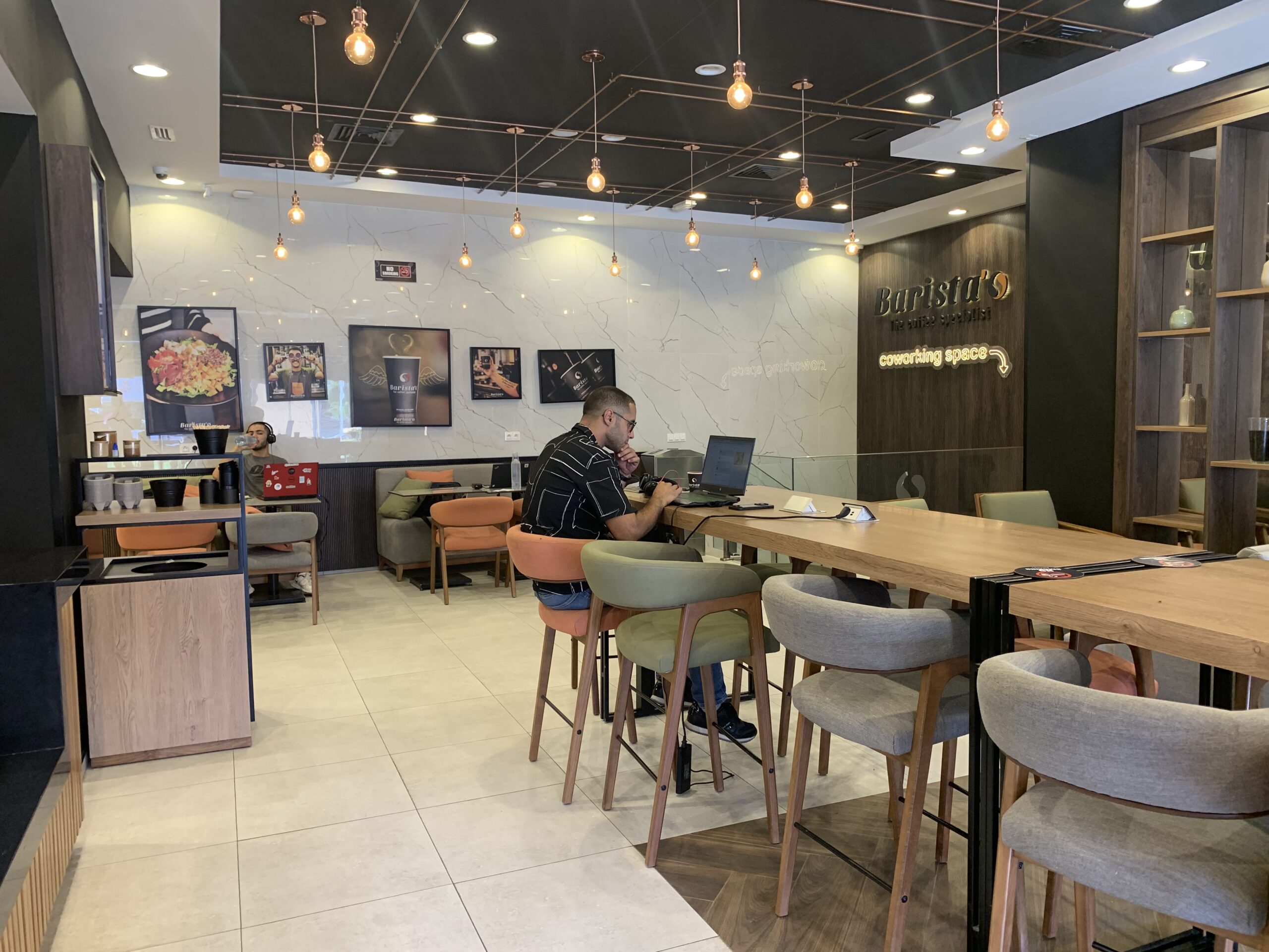 Altro punto a favore: la presenza di un coworking space. Si tratta di uno spazio a cui si accede a pagamento (10 dinari al giorno + 5 dinari di cauzione): lo si può pagare direttamente in cassa all’arrivo, viene dato un gettone che permette l’accesso. Si scende le scale e ci si trova in una grande stanza, silenziosa, con tavoli spaziosi, divanetti in caso di pausa relax e uno spazio fumatori diviso da una porta chiusa. La connessione internet è più veloce di quella presente al piano terra. Mi è stato detto che quello de l’Aouina è l’unico punto vendita della catena in cui finora in cui è presente questo spazio: una sorta di progetto pilota che poi sarà esportato anche negli altri quartieri.
