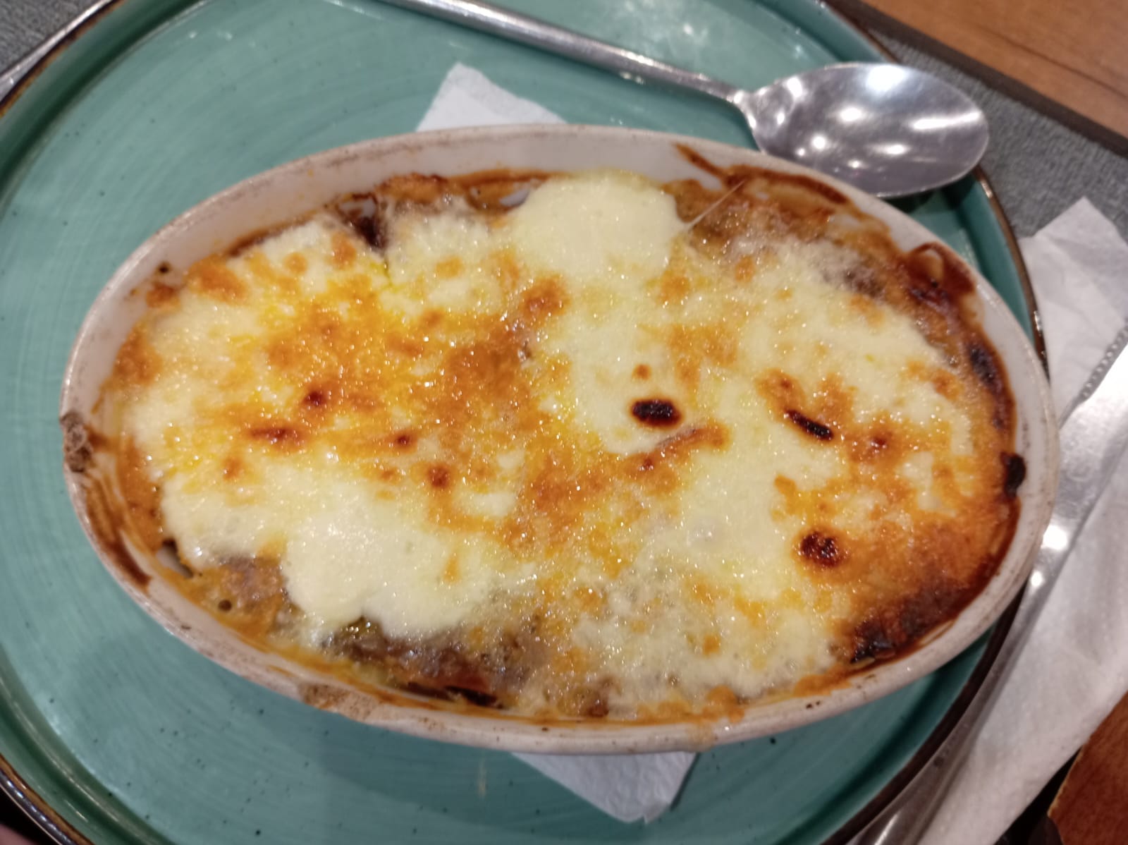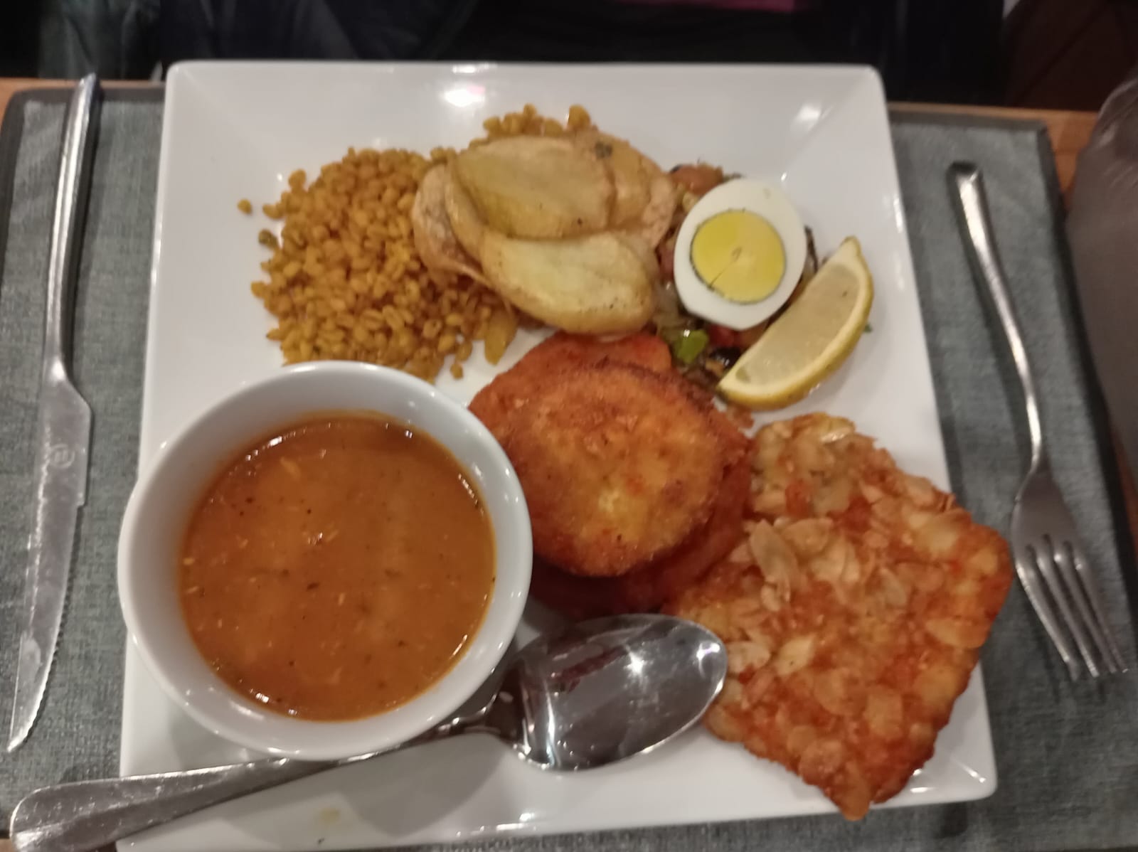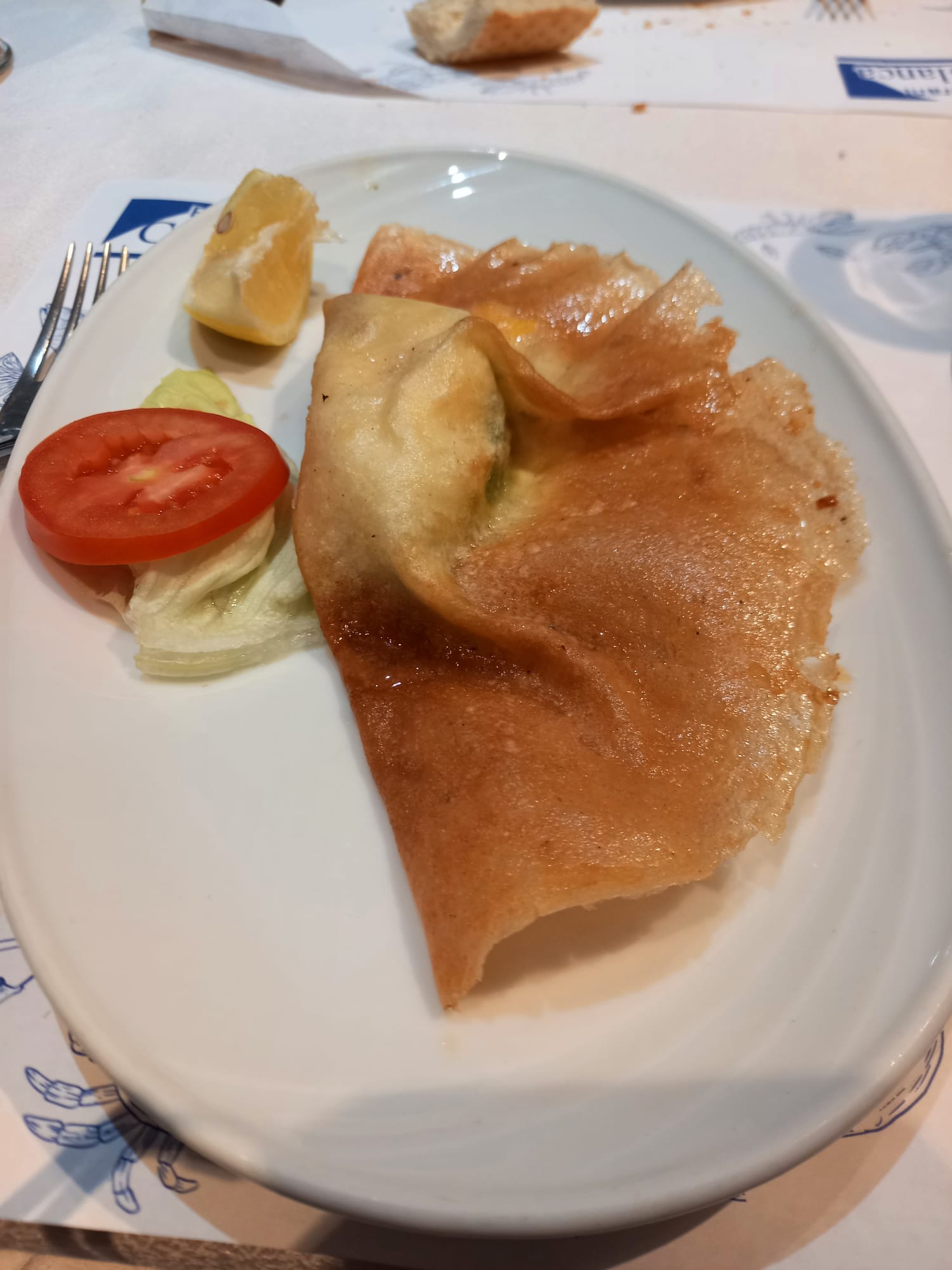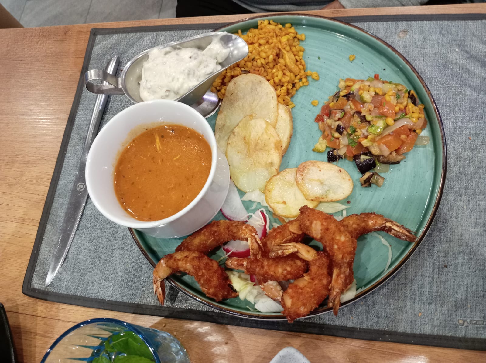 Gli altri piatti erano delle lasagne, dei gamberi impanati alle mandorle e un piatto con una zuppa (chorba), un petto di pollo impanato alle mandorle e una carne sempre di pollo impanata. Tutti i piatti erano serviti con contorno ben presentato. Come antipasto, offerto, ci hanno servito un pane tirato e cotto in forno a legna con semi di sesamo accompagnato da olive, harissa e maionese. Abbiamo speso 113 dinari compresa una bottiglia di acqua servita in bottiglia di vetro.