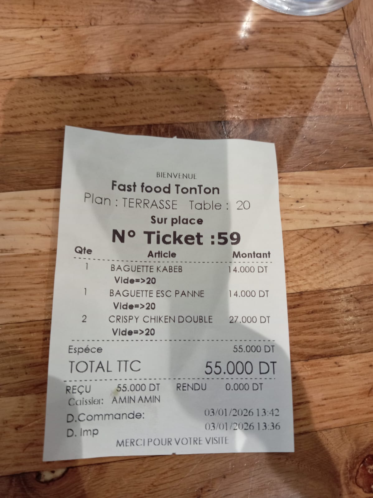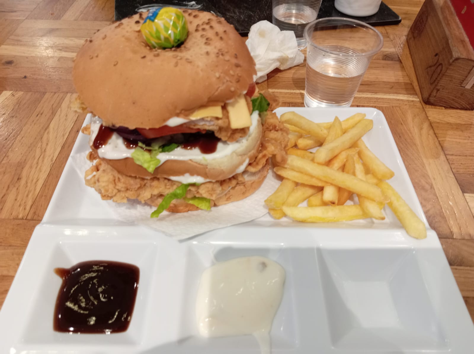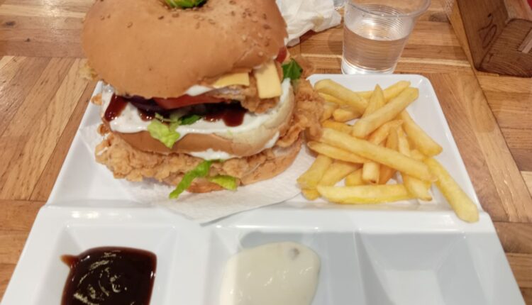 Il fast food offre una formula veloce, tavoli lunghi dove la gente si alterna in modo abbastanza veloce, qui abbiamo ordinato due hamburger Chicken double crispy che erano una favola, con la finezza di tenerlo insieme  da un lecca lecca! Inoltre due baguette farcie, una con kebab e una con fesa di pollo impanata. Abbiamo speso 55 dinari, un prezzo giusto per quello che abbiamo mangiato.