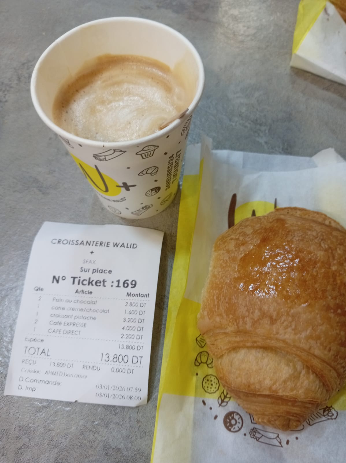 Per colazione siamo sempre andati da Croissanterie Walid: hanno formule di colazioni abbondanti, ma anche una vasta scelta di brioche sia dolci che salate e vari caffè. Noi abbiamo scelto formule classiche con caffè e croissant e siamo stati molto contenti. Per due caffè espressi, un caffèlatte e quattro croissant abbiamo speso 13.800 dinari, assolutamente nella norma e per la qualità e la generosità lo trovo un prezzo più che onesto. Per me questo caffè è strapromosso, l’ho proprio amato tanto!