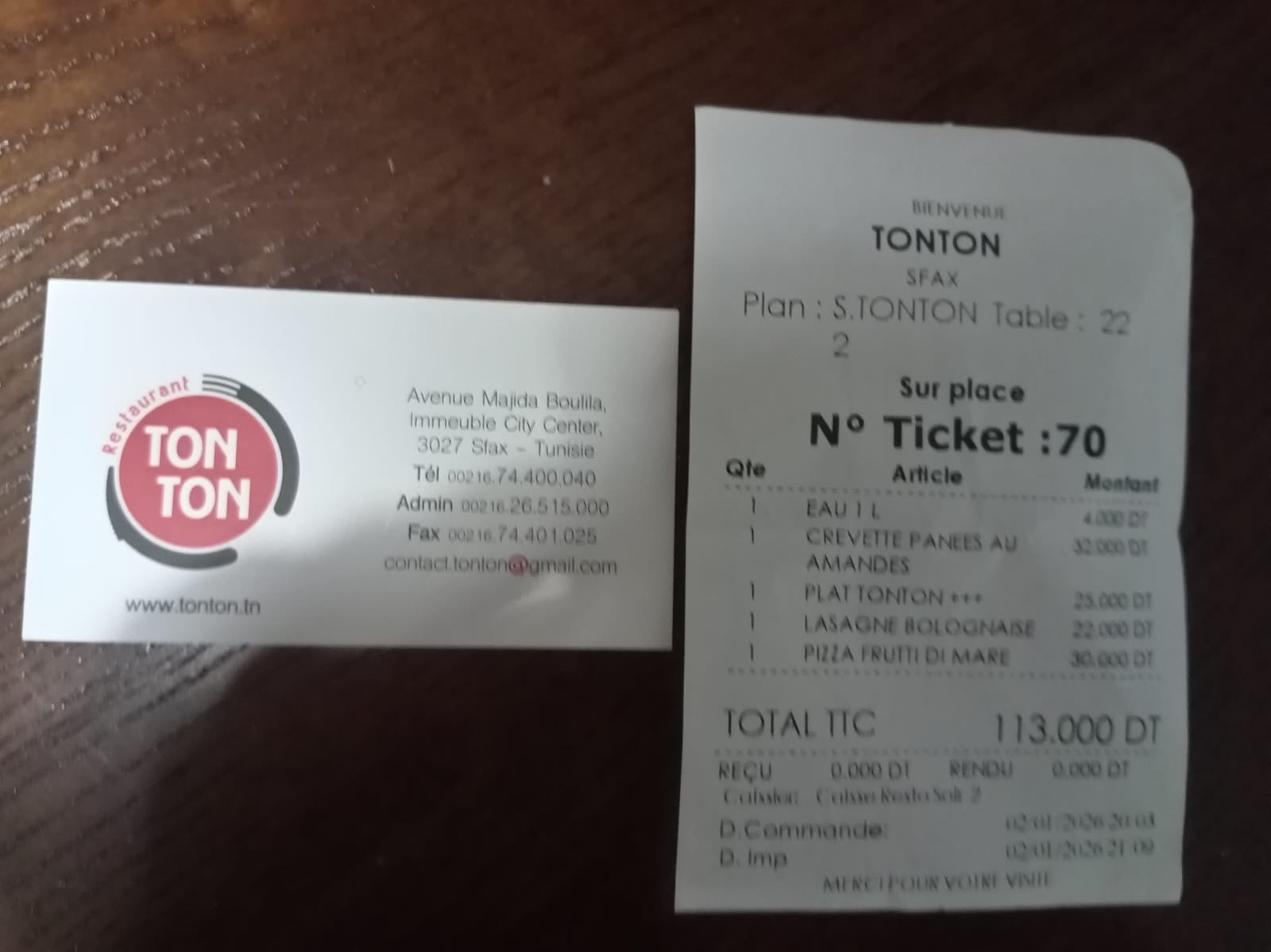 A Sfax abbiamo mangiato al ristorante TON TON in centro città, molto carino e curato. Hanno un piano superiore ristorante e un piano terra per fast food, abbiamo provato entrambi. Il ristorante alla sera e fast food qualche giorno più tardi a pranzo ed entrambe le formule ci hanno soddisfatto! Il ristorante ha un servizio curato, prezzi nella media e cibo molto buono. Io ho preso la pizza ai frutti di mare e devo ammettere che sia la pasta che la mozzarella hanno superato le mie aspettative.