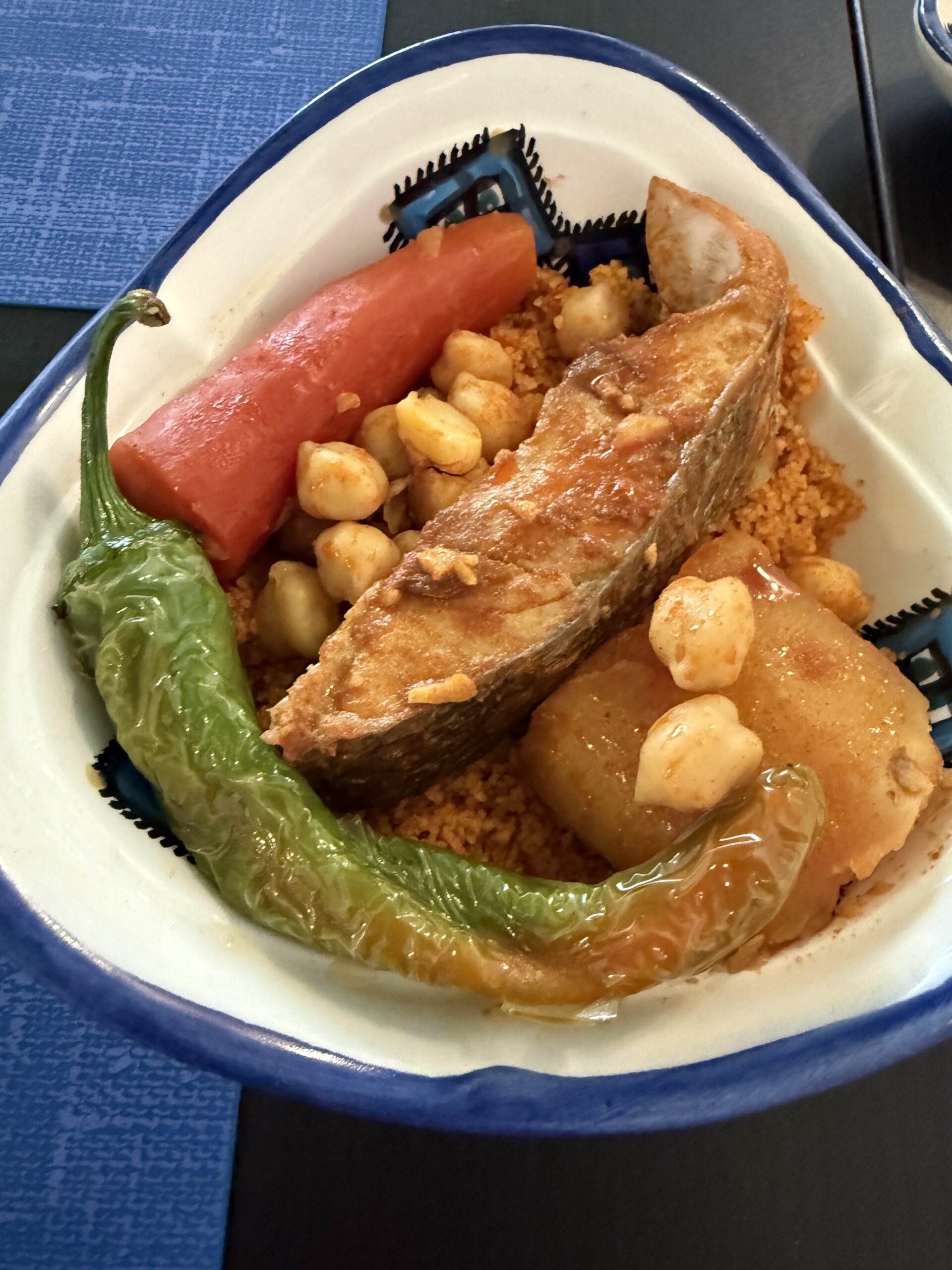 Mi accomodo a tavola, al piano superiore. Il locale non è molto grande, ma è molto carino e curato. Su ogni tavolo, delle tovagliette blu dove spiccano dei piatti in ceramica bianchi e blu con le tipiche decorazioni tunisine. Il menù degustazione prevede antipasti, piatti principali e dolci: salto gli antipasti perché non ho molta fame e preferisco passare direttamente ai piatti principali. Tra gli antipasti vengono proposti: brik, ommek hourria, insalata mechouia, insalata verde e market khodra. Sono sei i piatti che mi vengono portati – la quantità è quella per due persone -: alcuni li conosco già, altri sono completamente nuovi. Mi portano il cous cous con il pesce, accompagnato dall’insalata torchi, la mloukhya, la kamounia, l’agnello con patate, datteri, fichi e mandorle e il peperone ripieno. Le novità per me sono rappresentate dall’insalata torchi(un’insalata sott’aceto che di solito accompagna il cous cous) e dall’agnello, che ho mangiato ancora, ma non con questa combinazione.