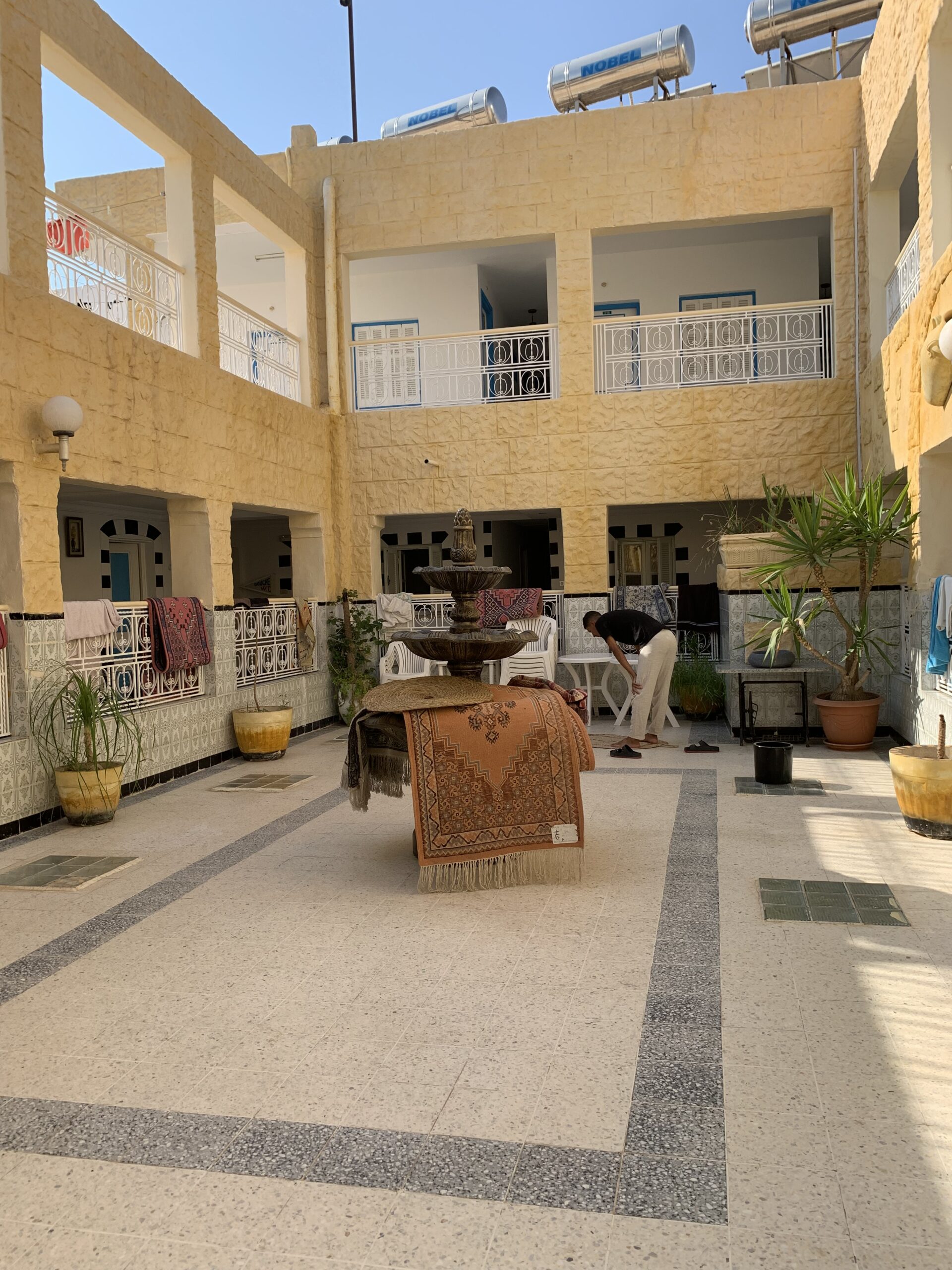 Quando arriviamo a Sousse, a causa di un forte ritardo nel trasporto ferroviario, sono ormai le due del pomeriggio. Alla reception controllano la nostra prenotazione e ci consegnano la chiave della camera, mostrandoci la struttura. L’hotel è come una dar arbi: un cortile su cui si aprono le varie stanze, su due piani, e sul tetto sono tirati dei fili per stendere a far asciugare i propri vestiti, in caso di necessità, ma c’è anche un dondolo, un gazebo per il sole e dei tavolini con sedie per chi volesse rilassarsi un po’ nelle aree comuni. La camera che mi hanno assegnato ha un letto matrimoniale, una finestra che si apre sulla Medina, un ventilatore sopra la porta, un comodino, una poltrona, un piccolo specchio. Sul letto sono forniti gli asciugamani puliti: uno grande per la doccia e uno più piccolo per il viso.