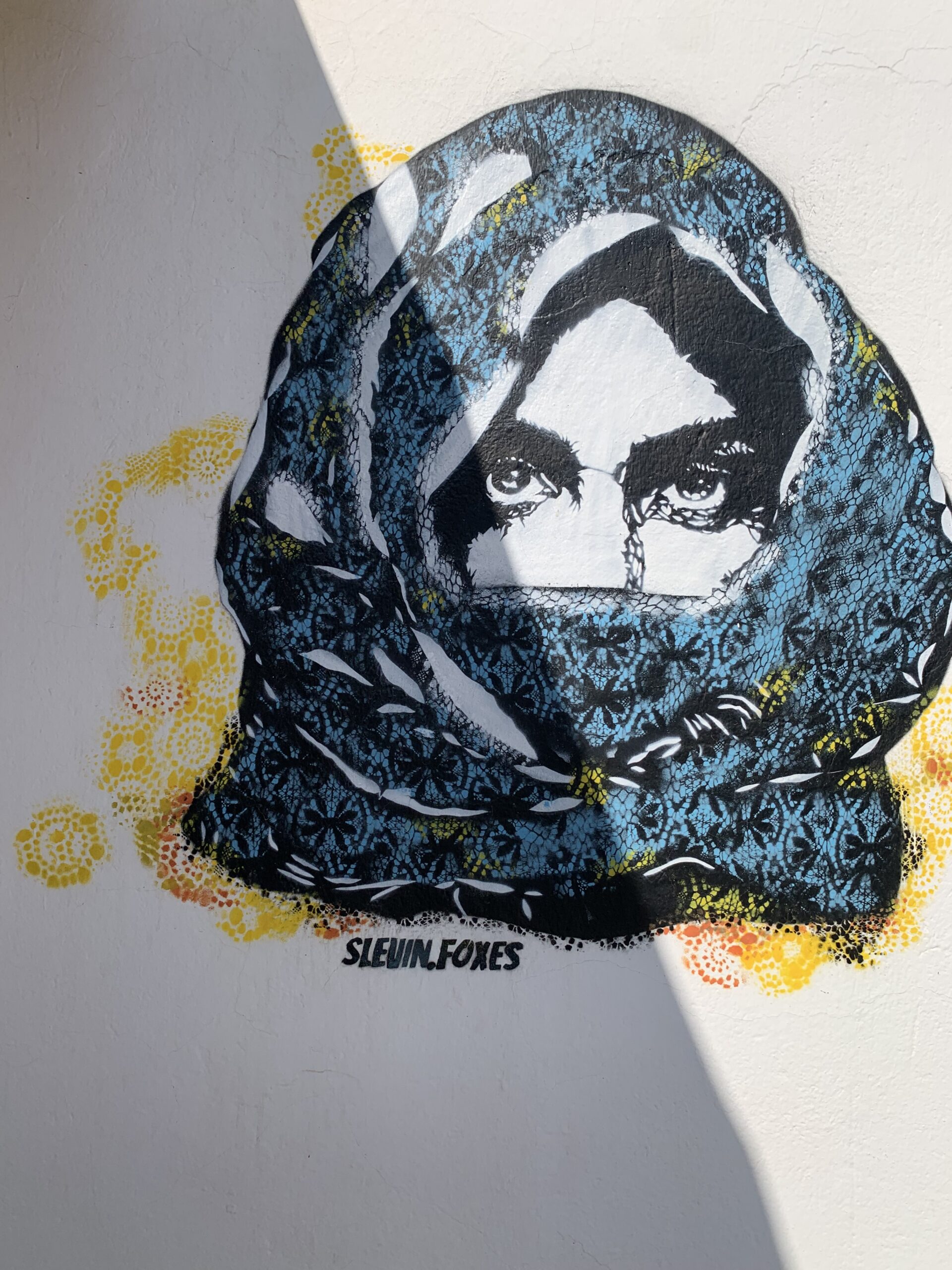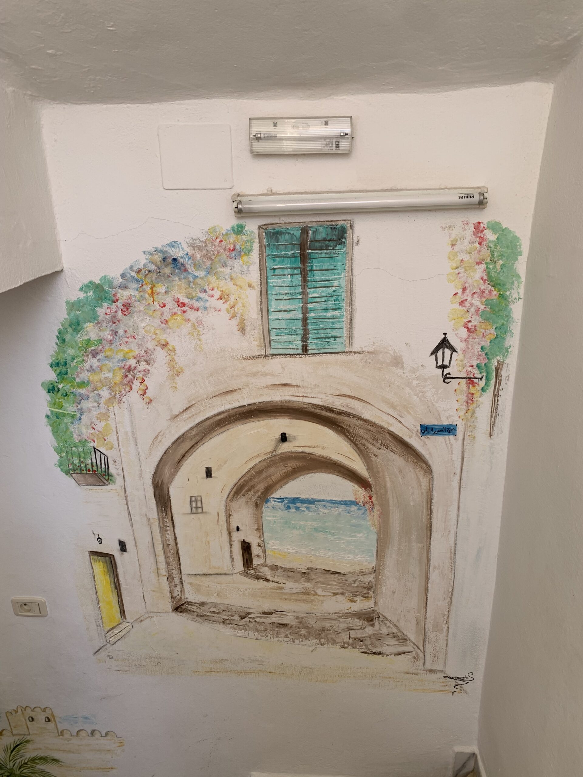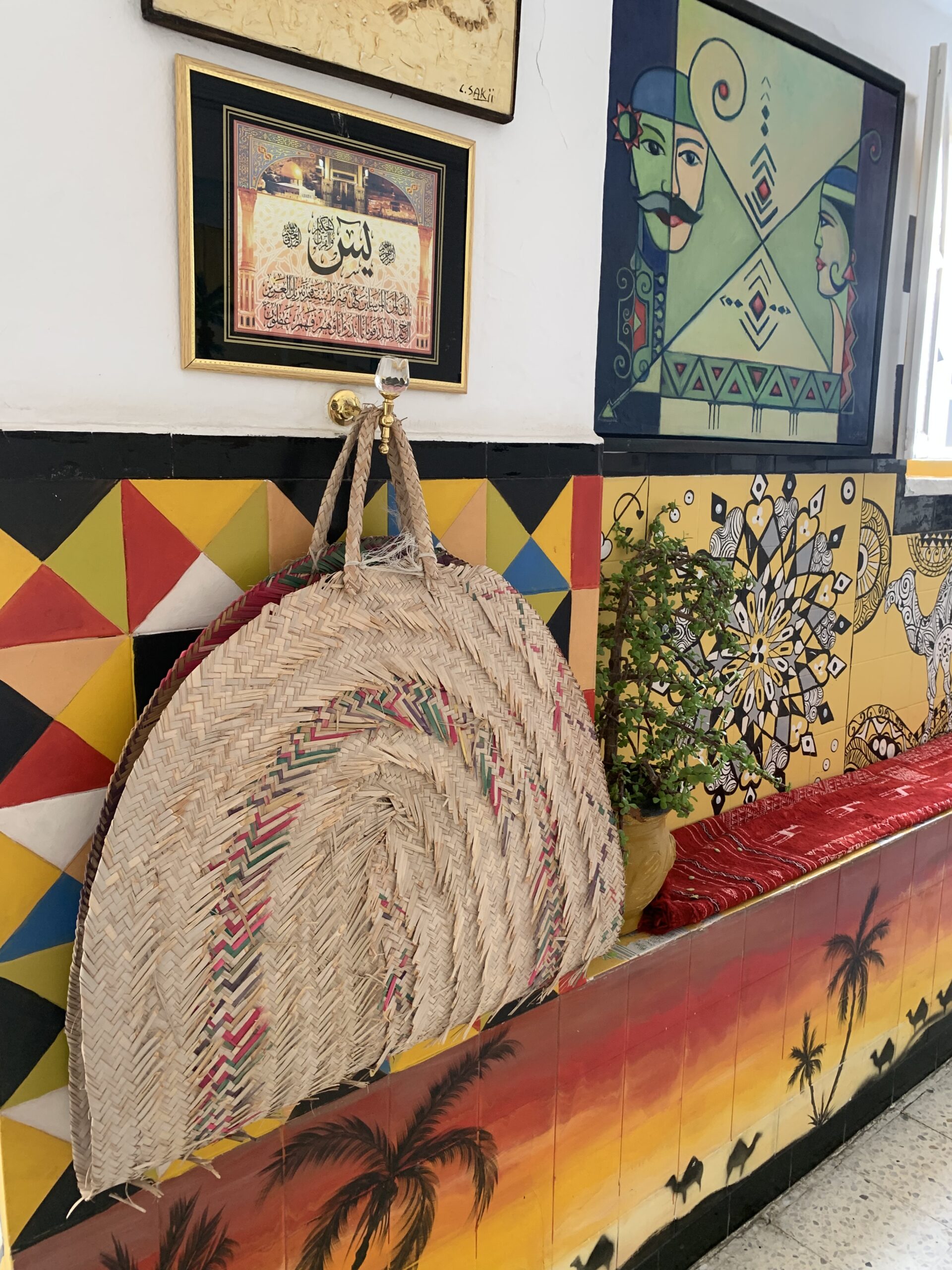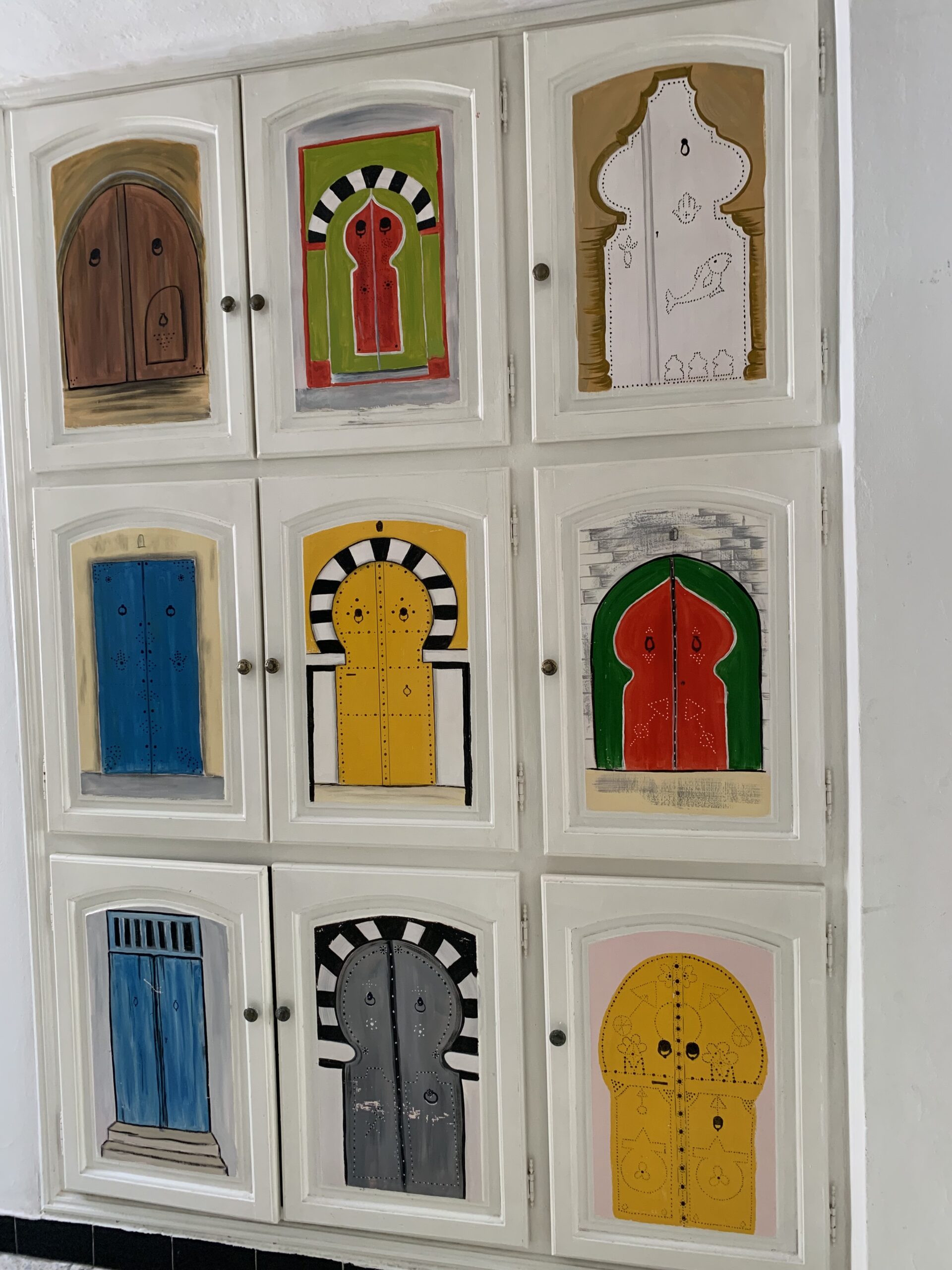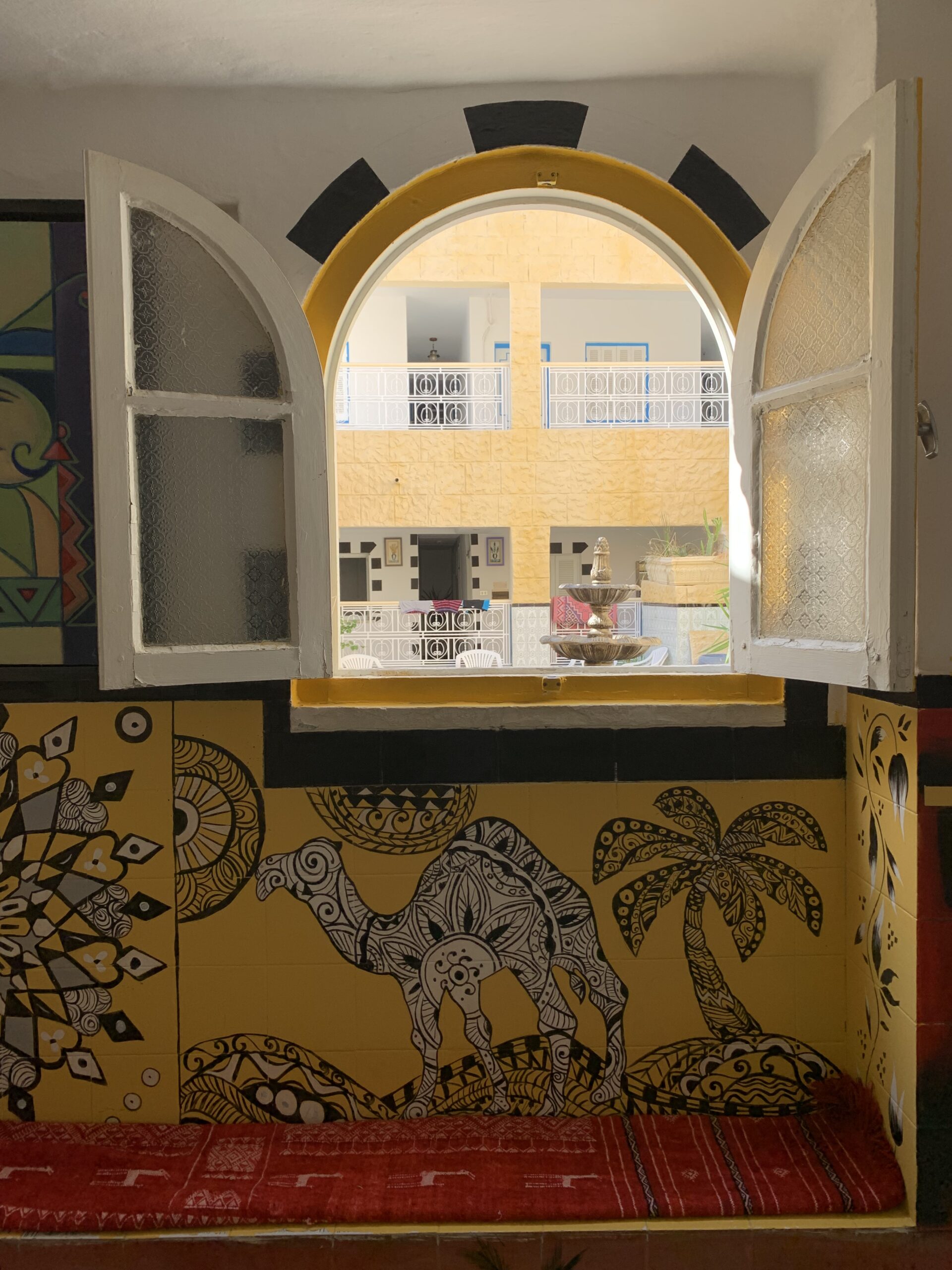 Le mura dei corridoi e degli spazi comuni sono decorate: è tutto molto colorato, con richiami a decorazioni tipiche tunisine, come le porte blu, la mano di Fatima, fino al deserto, ai volti amazigh. Nel cortile e negli spazi comuni ci sono sedie, poltroncine e tavolini. Nel mezzo del cortile c’è una fontana – non funzionante – .