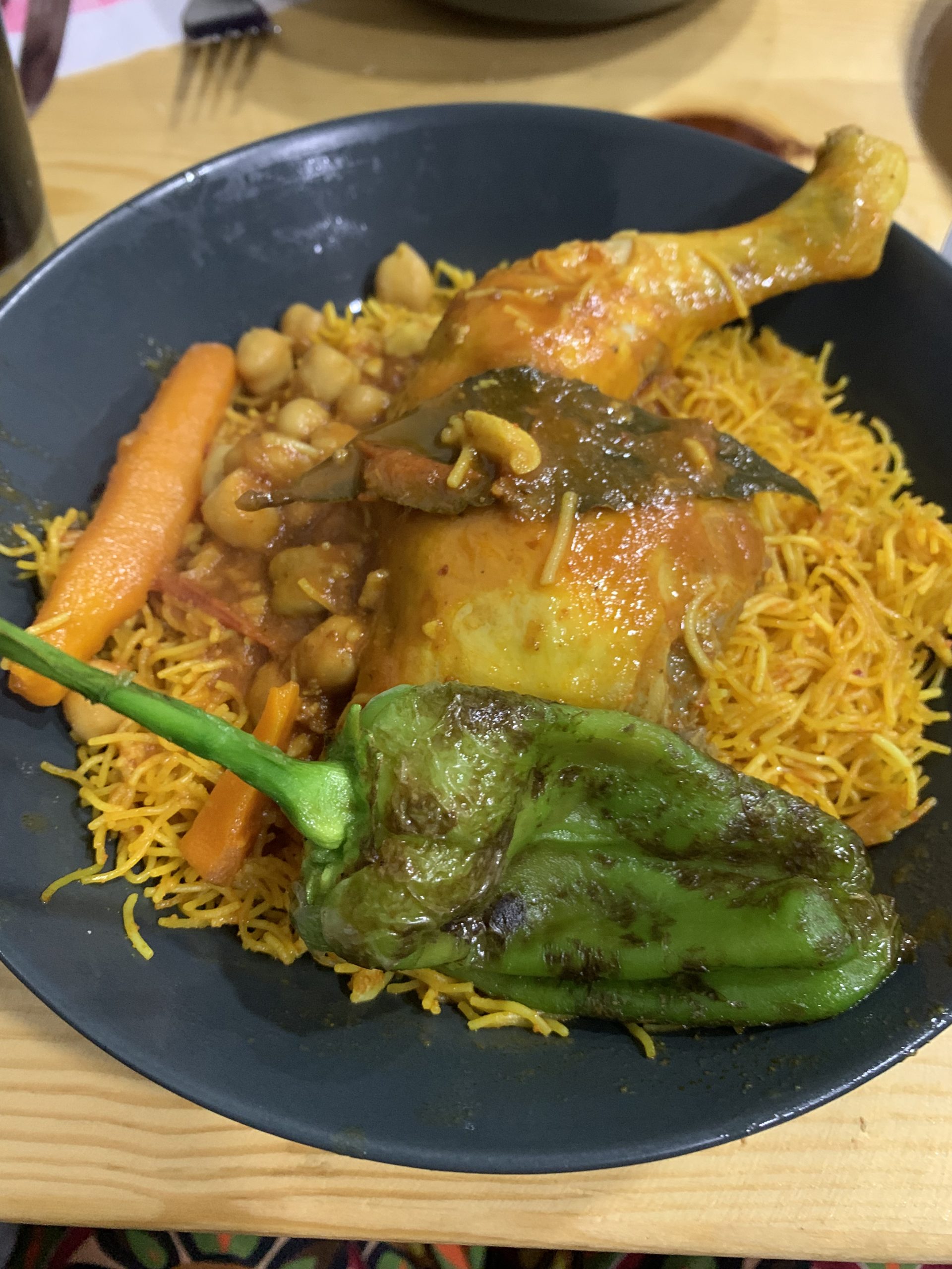 E’ il momento del piatto principale della nostra cena: la dwida, accompagnata da carne di pollo, peperone e carote. Il piatto è abbondante e la pasta davvero deliziosa. Tra una chiacchiera e l’altra, sono ormai le 22.00: è ora di tornare al nostro alloggio. Paghiamo: 15 dinari a testa, circa 5 euro.
