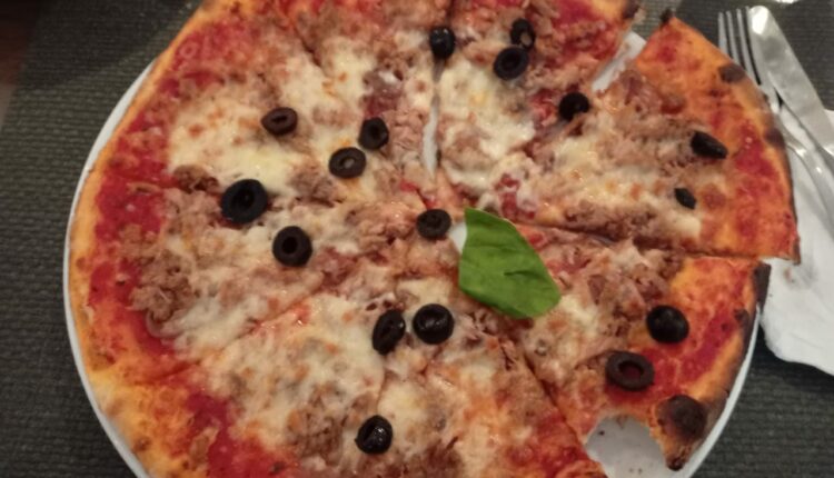 La seconda volta ci torno al 31 dicembre 2024 sempre a pranzo con mia figlia, mia mamma mi ha regalato un buono in quel ristorante visto il mio entusiasmo. Il menù prevedeva del pesce come piatto principale, ma lo avrei già mangiato per cena, così optiamo per due pizze e due dessert. Siccome la pizza in Tunisia raramente la mangio fuori e la faccio a casa, mi dico se fanno bene anche la pizza sarà amore per sempre! Non mi sbilancio e prendo il gusto classico tunisino: la pizza con tonno, 16 dinari l’una. Quando arriva con le foglie di basilico fresche sopra già sono felice! Infatti è ottima approvata sia da me che da mia figlia!