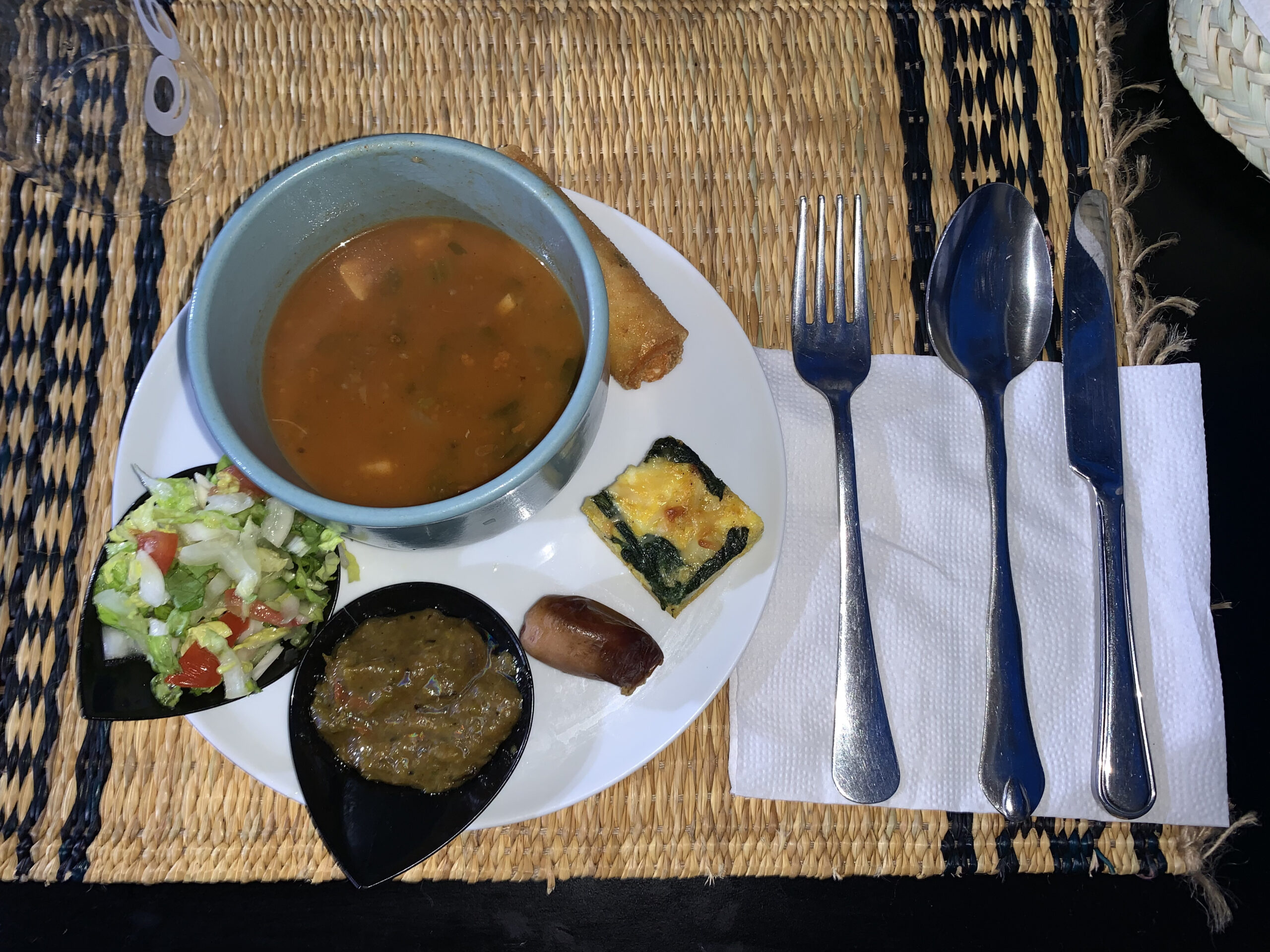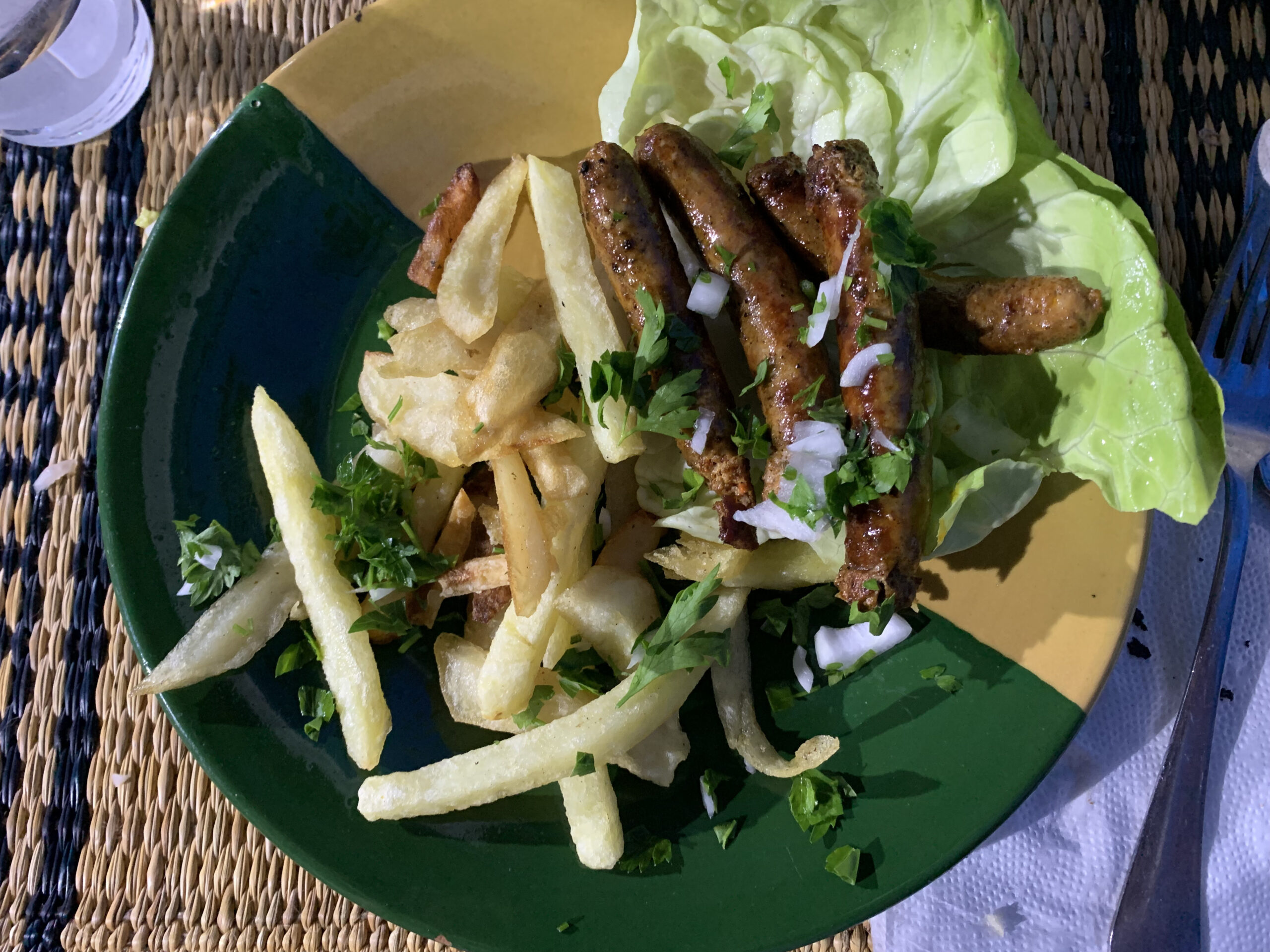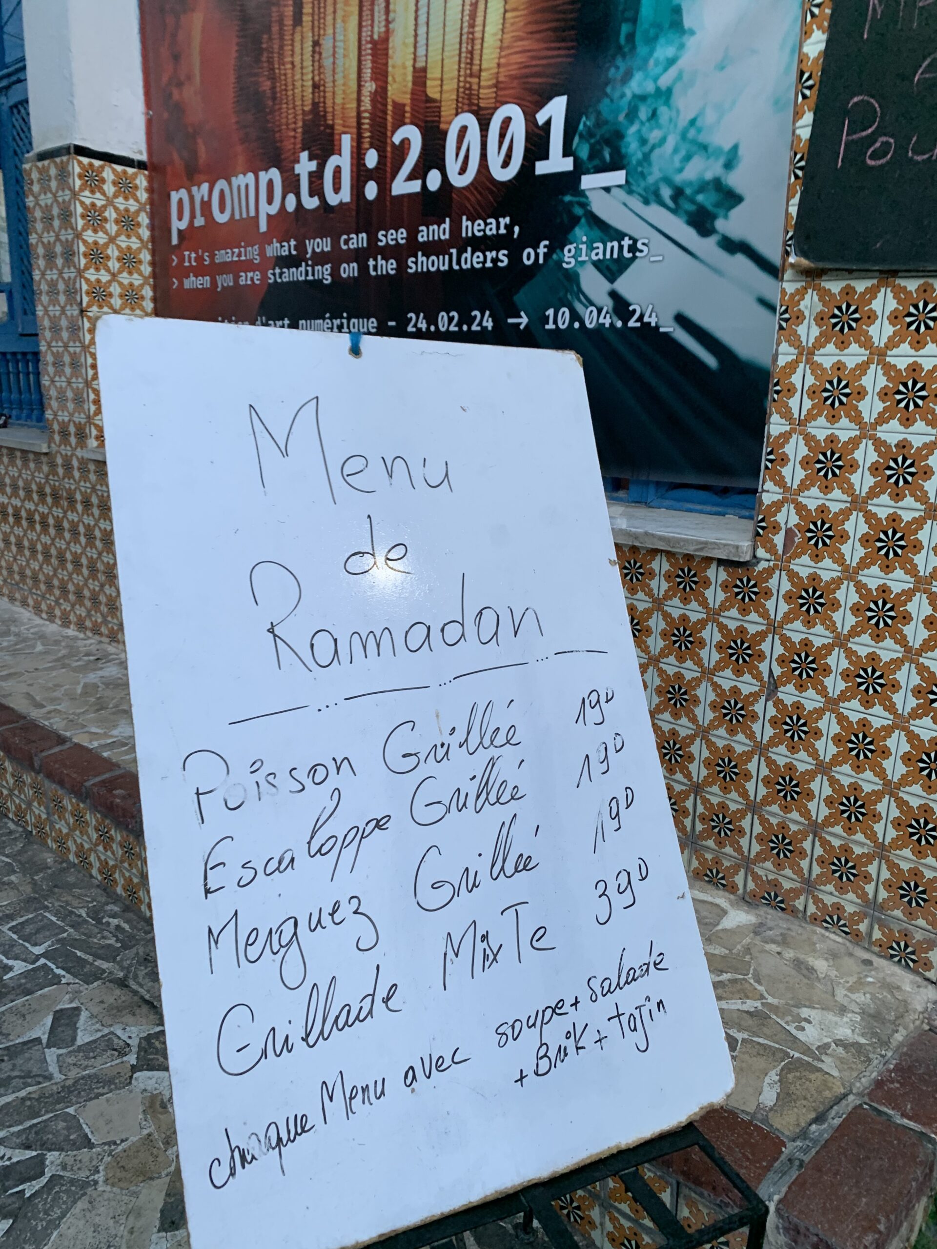 Siamo andati in questo café durante Ramadan, attratti dal cartello in bella vista con il menù proposto: 19 dinari con zuppa, insalata, Brik, tajine e piatto principale ci sembrava un ottimo affare. Abbiamo prenotato e all’ora dell’iftar ci siamo presentati. Dopo averci fatto accomodare, abbiamo aspettato un po’ prima di essere serviti. Ci è stato portato un piatto con una piccola ciotola di chorba; sullo stesso piatto un Brik – piccolo, a dita di Fatima – , un quadratino di tajine, un dattero, un assaggio di insalata mista e di insalata mechouia. Come piatto principale avevo scelto le merguez: erano quattro a numero, con delle patatine fritte che non erano del tutto cotte. Il bere, come spesso accade con i menu dei Ramadan era a parte: 4 dinari per una bottiglia di acqua naturale, un prezzo che nei ristoranti e nei cafè è ormai la media.