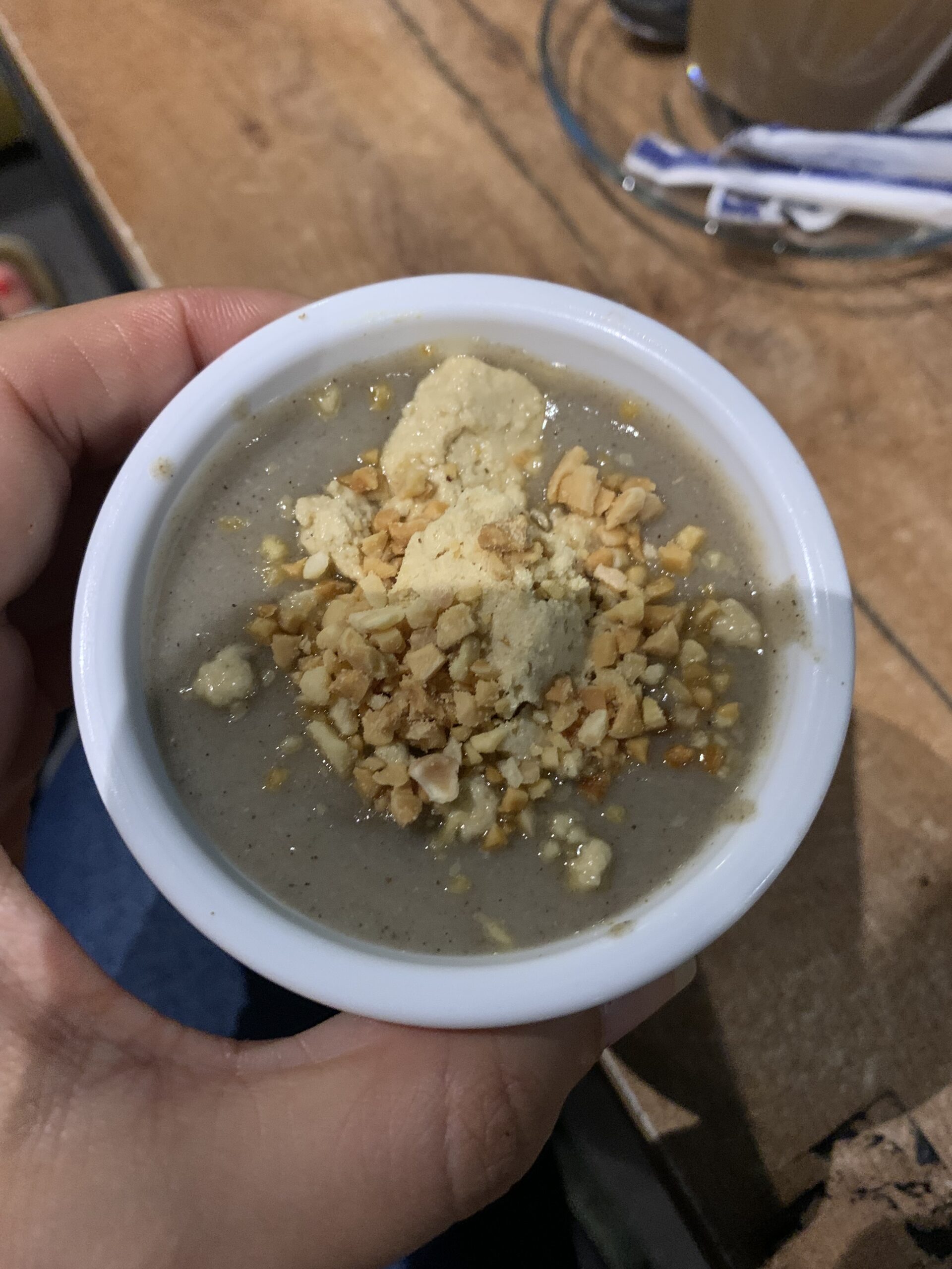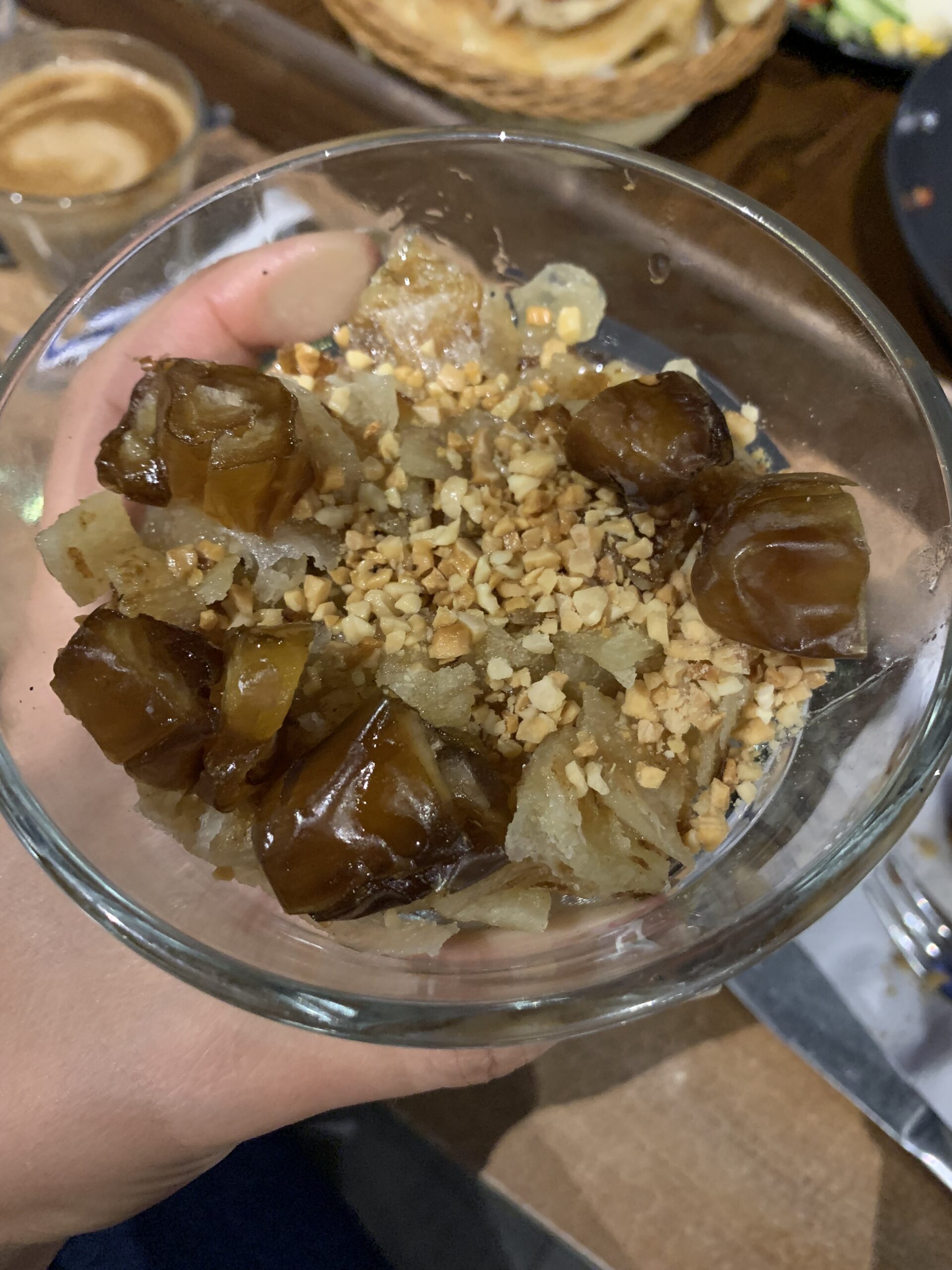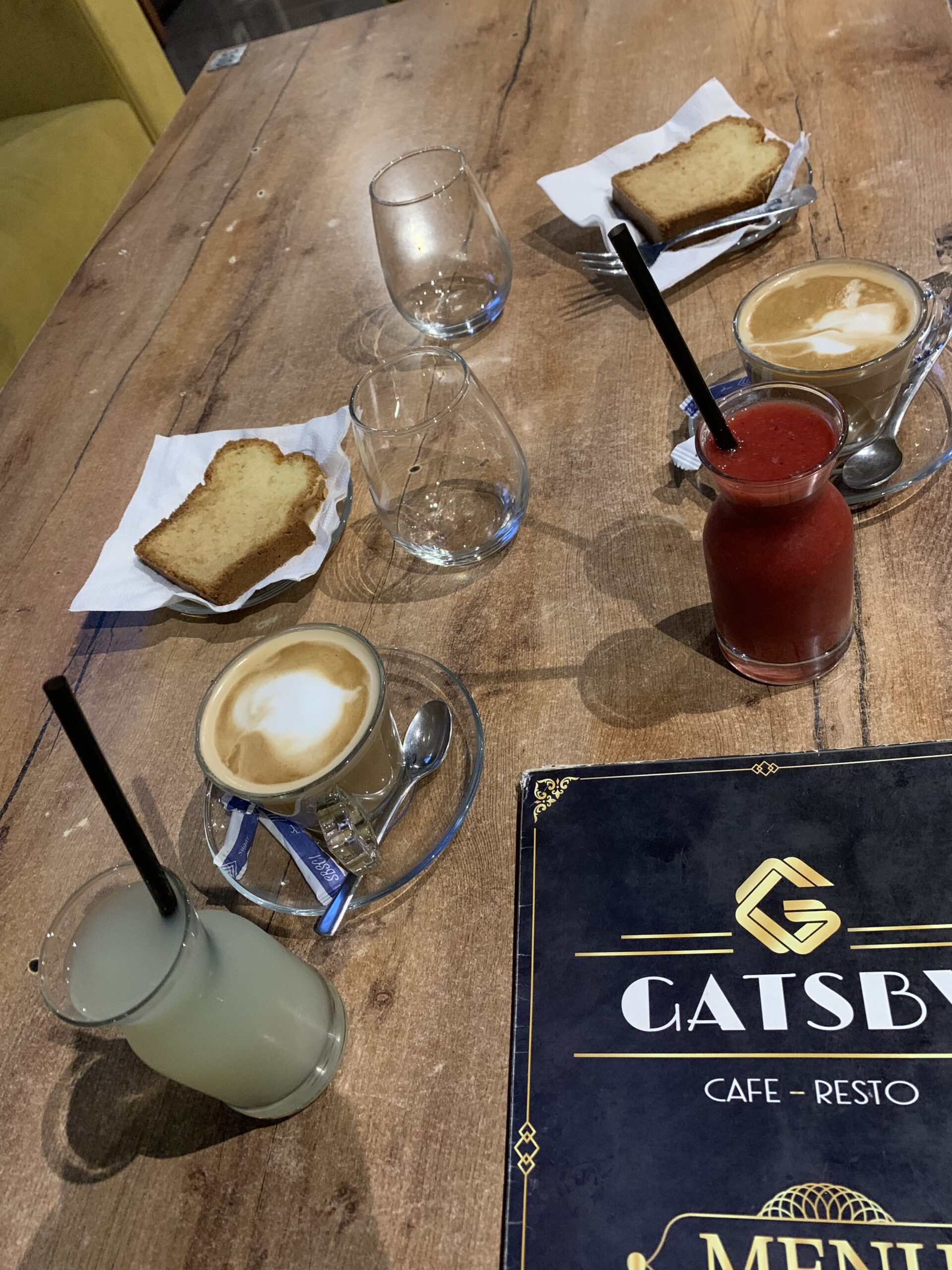 In un cafè – ristorante a l’Aouina, “Gatsby” abbiamo voluto provare proprio una colazione di questo genere: “Baldi”, per due persone, al costo di 37 dinari. La colazione comprendeva: caffè a scelta, cake (una sorta di plumcake), acqua da un litro, bsissa, degla (datteri), chamia (un tipo di dolce fatto con la frutta secca), burro, ricotta, olio d’oliva, harissa arbi (ossia fatta in casa), mlewi (un tipo di pane tipico tunisino), tastira, merguez, rfissa e dro3. Ci è stato offerto anche il succo, noi abbiamo preso una citronnade e un succo alla fragola.