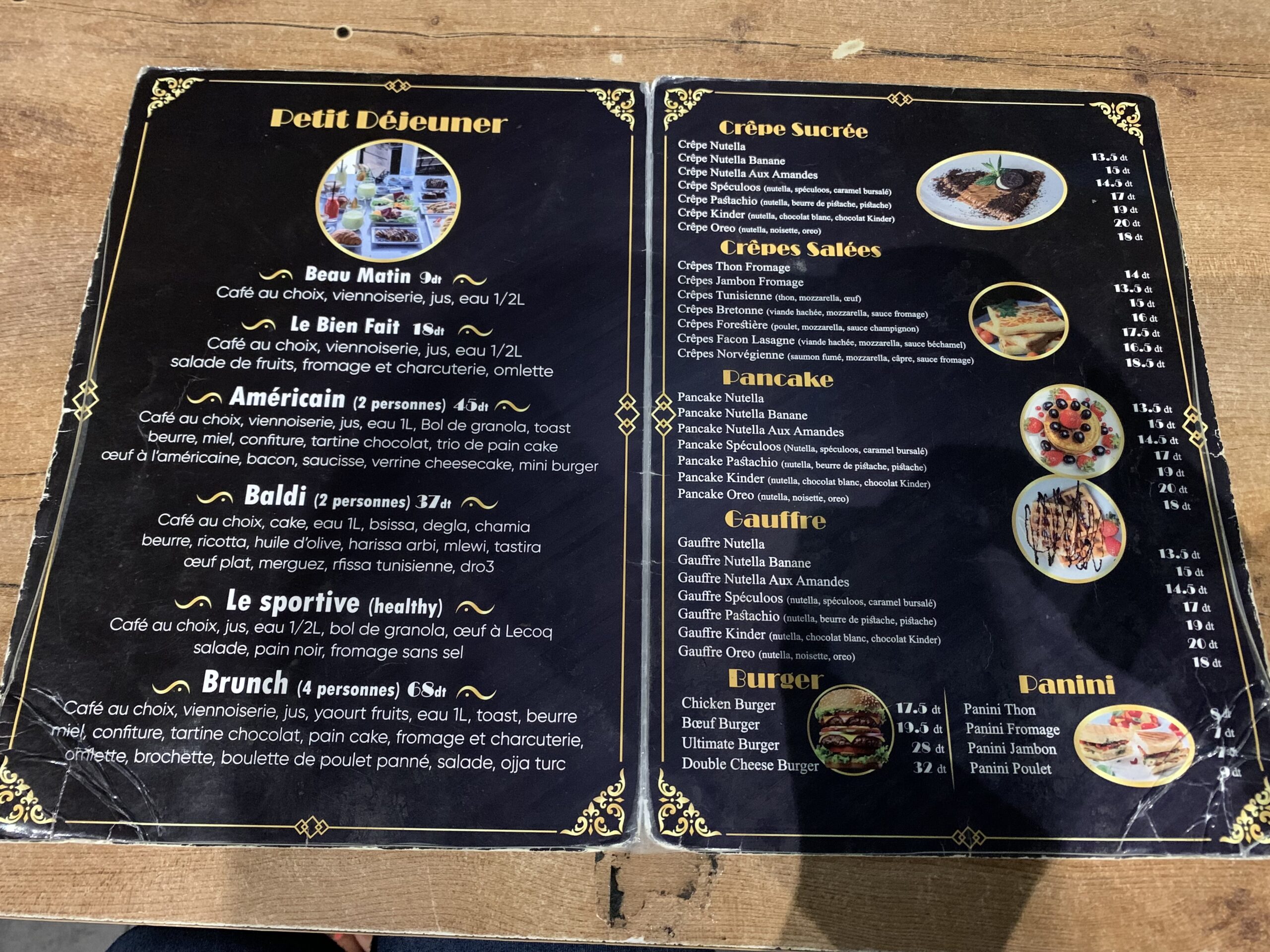 La colazione in Tunisia, nei vari café, è un vero e proprio rituale, soprattutto durante il week end. E’ difficile trovare café che offrano solo un’opzione per “le petit déjeuner”: si va da un minimo di tre “formule”, proposte, fino a dieci, dalle colazioni semplici con caffè, croissant, succhi di frutta, a quelle che sono un vero e proprio brunch, con piatti tipici tunisini, con prezzi ovviamente che aumentano a seconda della scelta, arrivando anche a 60 dinari.