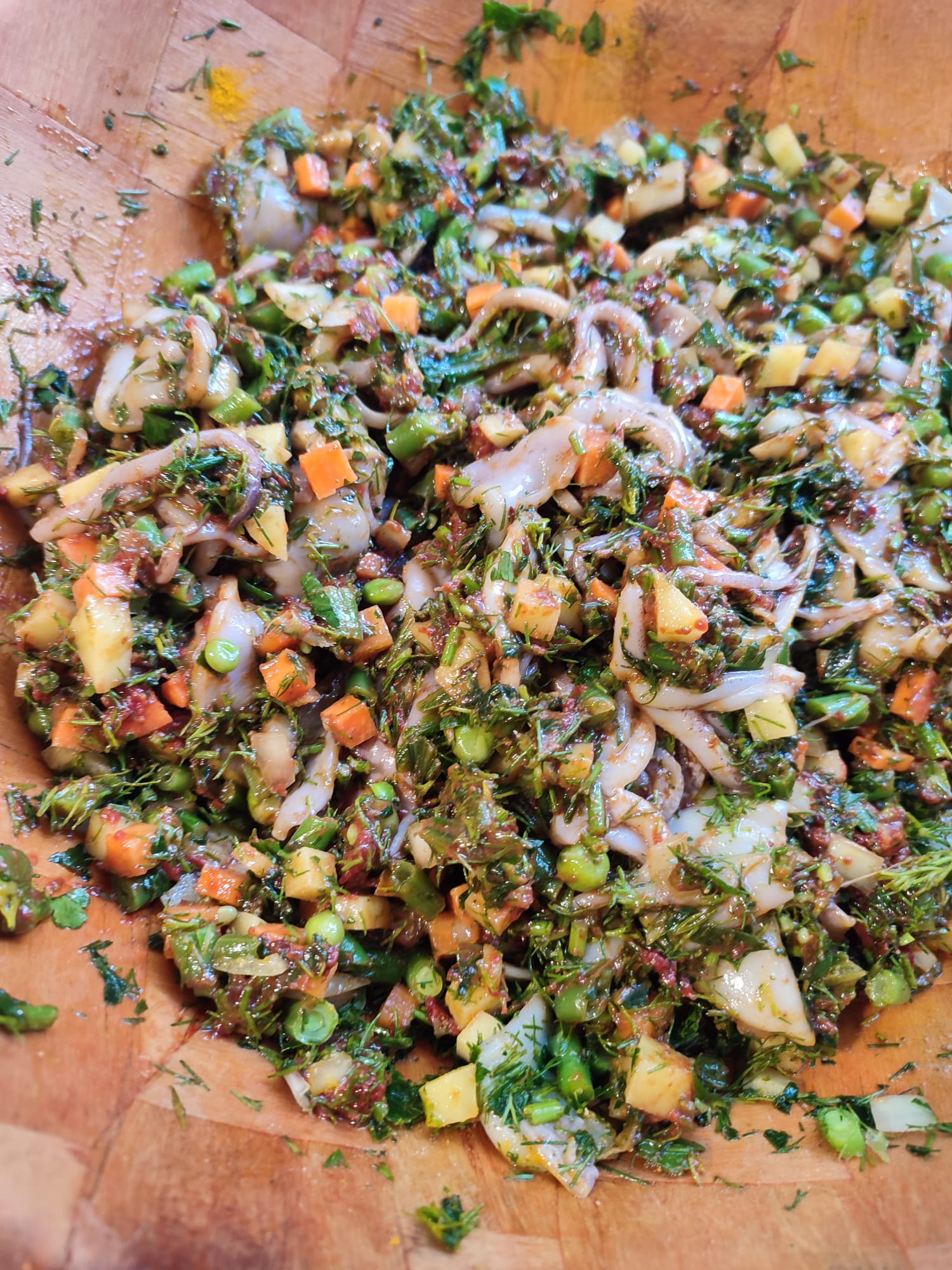 In una ciotola capiente mescolate tutti gli ingredienti insieme e trasferiteli nella parte alta della couscoussiera.