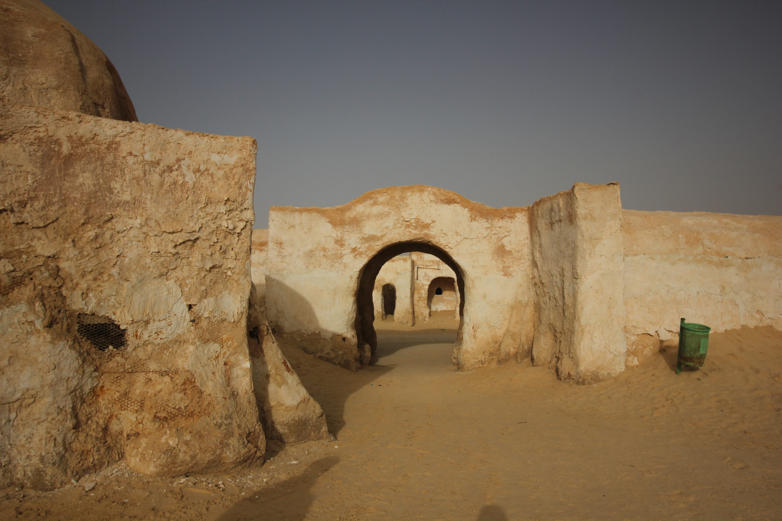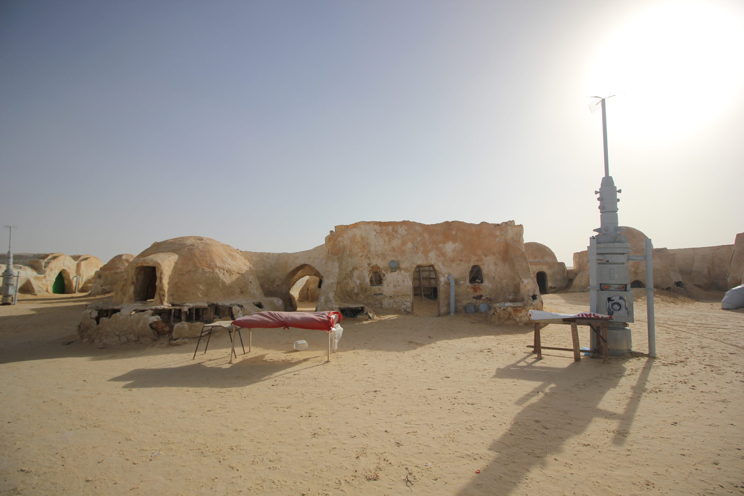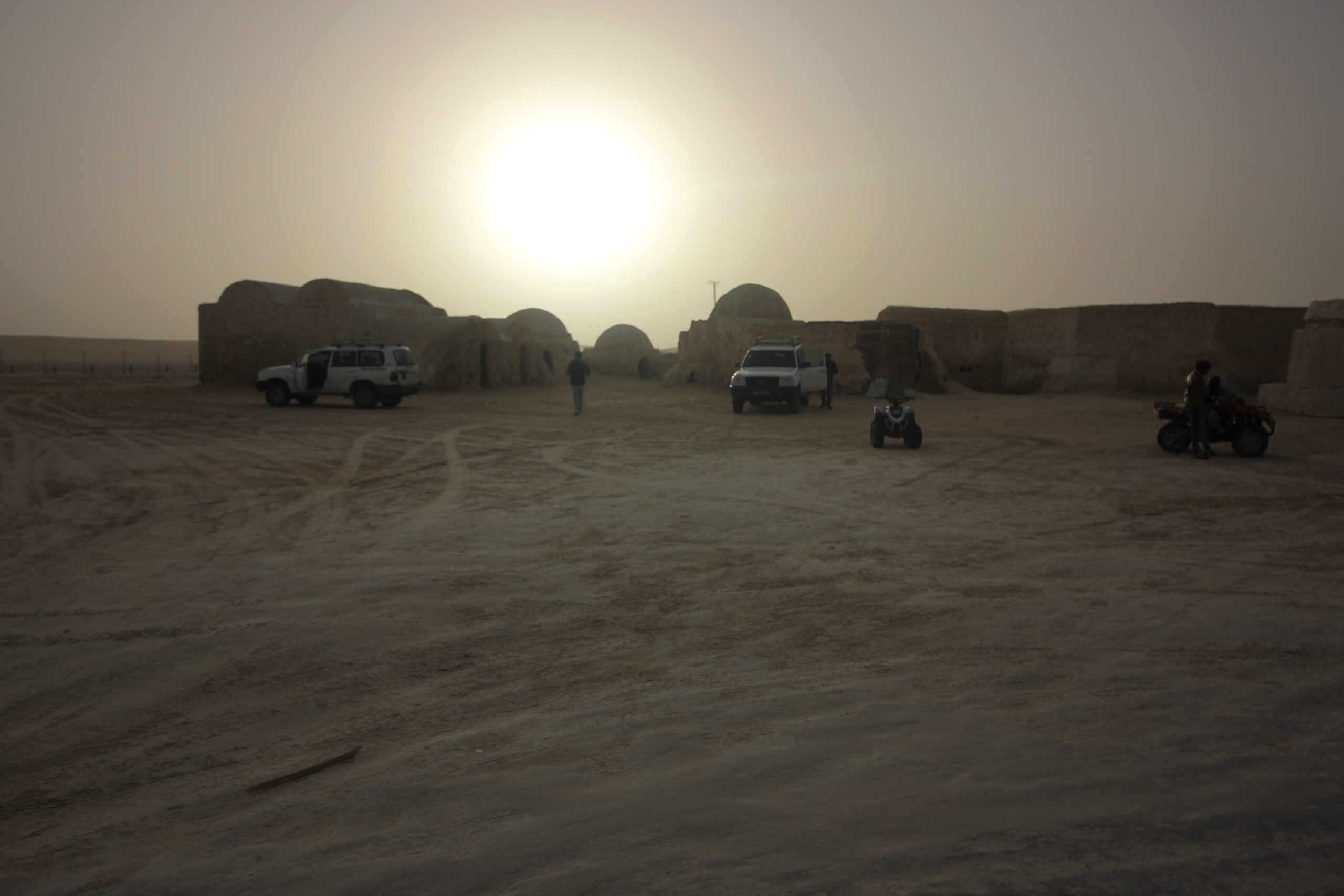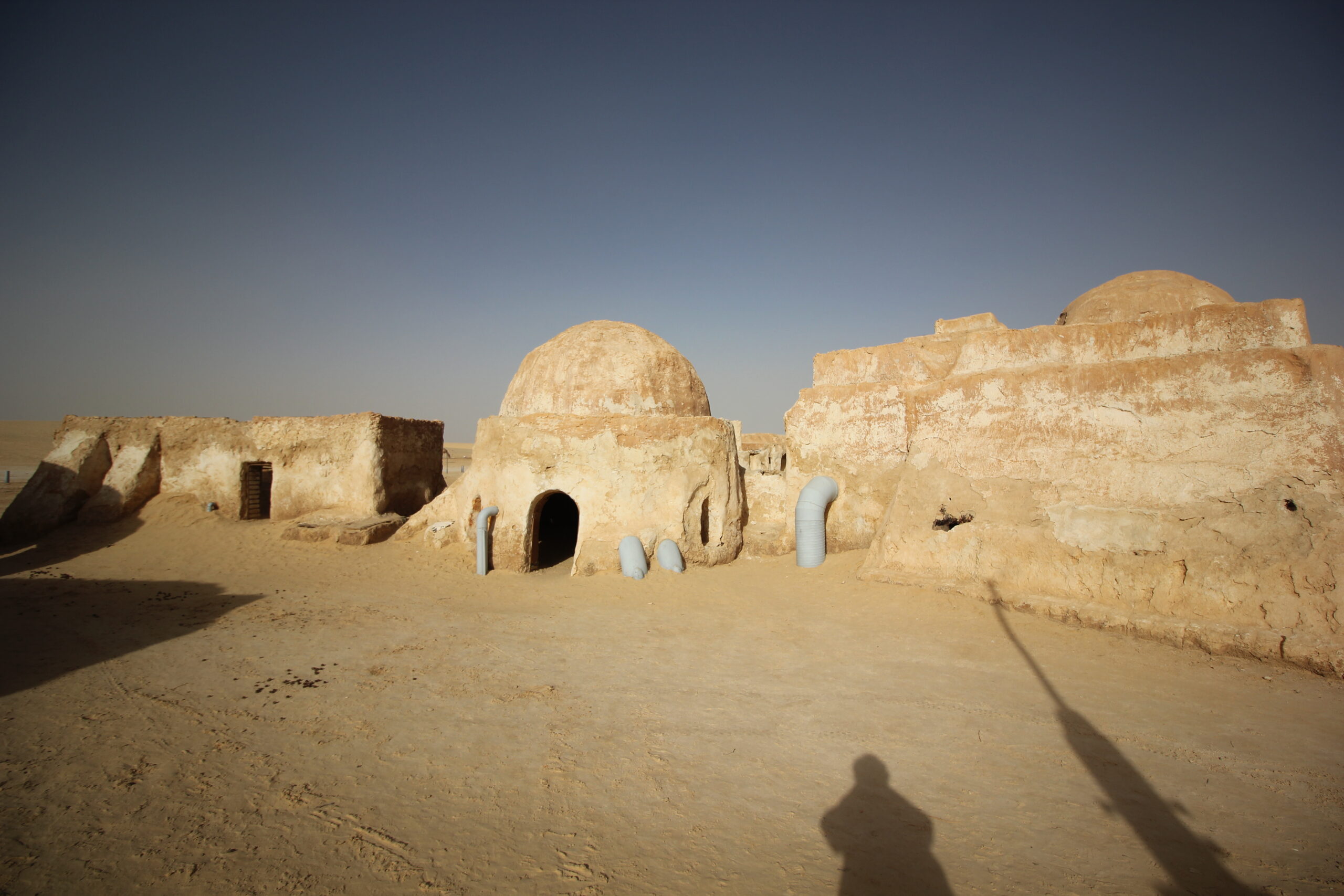 George Lucas ha costruito questo set nei pressi di Ong Jmel, la roccia a forma di cammello, meta ogni anno di escursioni e gite in 4×4 per turisti e tunisini, da cui si vede una sublime vista sul deserto e le oasi. Attualmente il set è ovviamente in disuso, e il deserto sta avanzando rapidamente, pertanto il governo tunisino sta cercando ogni anno di bloccare l’avanzata inesorabile della sabbia. Il tragitto dura una ventina di minuti, poi vediamo da lontano queste piccole costruzioni che sembrano trulli e capiamo di essere arrivati a destinazione. Il Sole è già basso sull’orizzonte, creando un effetto luce incredibilmente simile ai due soli del pianeta Tatooine. A proposito, George Lucas fu così impressionato e stimolato dal Sud tunisino che prese spunto dalla città di Tataouine per dare appunto il nome al pianeta, così come molti degli abiti usati dai jedi e dagli abitanti dei vari pianeti sono ispirati proprio dagli usi e costumi locali.