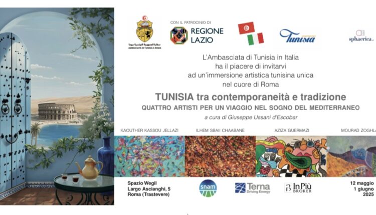COMUNICATO STAMPA – Promuovere la conoscenza della ricchezza e della diversità della cultura tuni- sina, offrendo al pubblico italiano un’opportunità unica per immergersi nel mondo dell’arte contemporanea tra valorizzazione delle tradizioni culturali e una costante ricerca di innovazione. L’Ambasciata della Repubblica Tunisina in Ita- lia, con il patrocinio della Regione Lazio, presentano ‘TUNISIA tra Contempo- raneità e Tradizione. Quattro artisti per un Viaggio nel Sogno del Mediterraneo’ a cura di Giuseppe Ussani d’Escobar, in programma a Roma, nello Spazio WeGil di Largo Ascianghi 5, fino al primo giugno 2025.